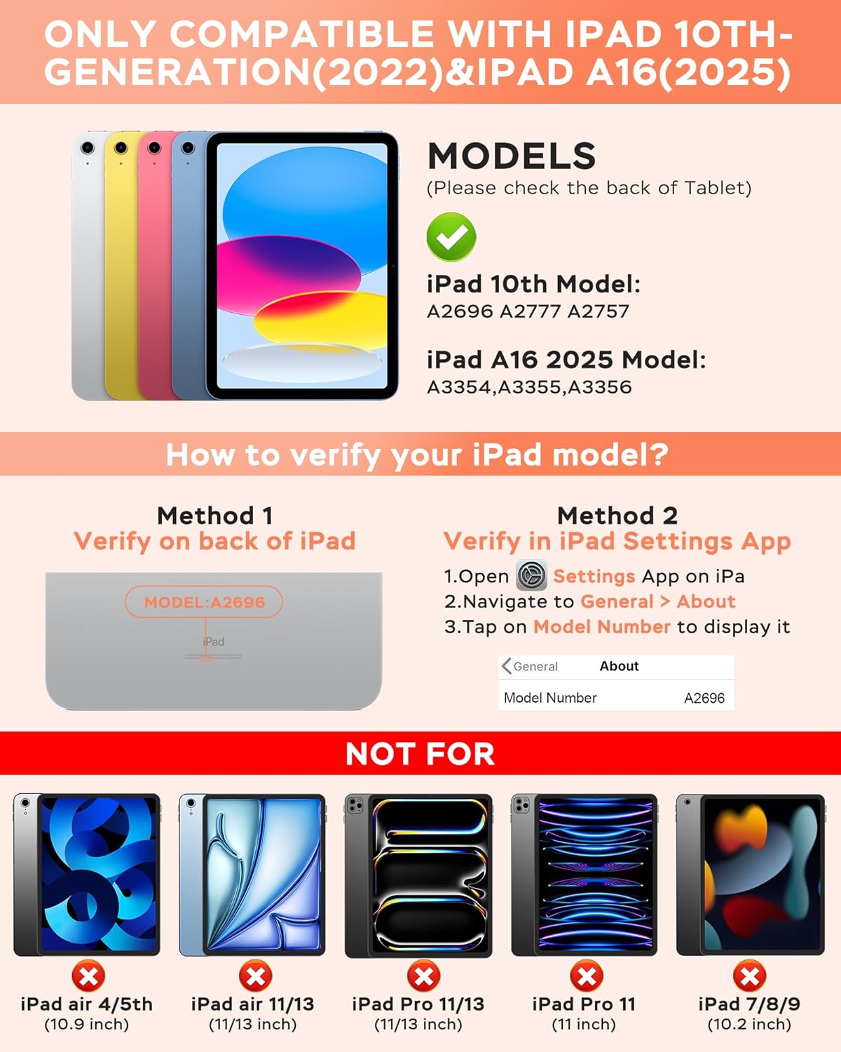 - Compatibility: Designed for iPad 10th Generation (2022) 10.9-inch (Models: A2696, A2757, A2777) and iPad A16 (2025). Not compatible with other iPad models. Please check the model number on the back of your iPad to ensure a perfect fit