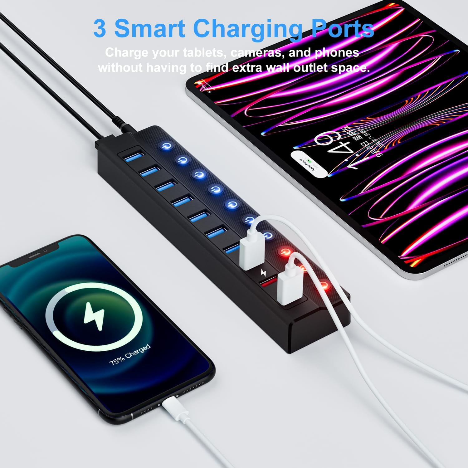 Powered USB Hub, 10-Port USB Splitter Hub (7 Faster Data Transfer Ports+ 3 Smart Charging Port) with Individual LED On/Off Switches and 12V/3A Power Adapter USB Extension for Mac, PC and More