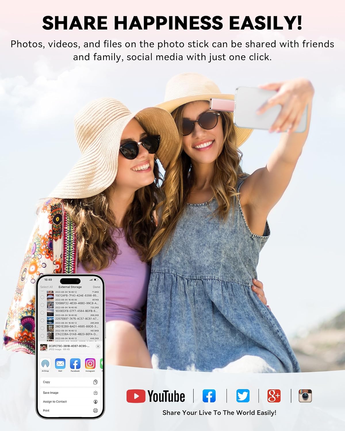 - 【Stylish, Portable, and Secure】With a compact and stylish design, this flash drive for iPhone is available in blue, pink, black and gold, making it easy to carry around. The built-in encryption option allows you to set a password via the APP to secure your personal files, photos and videos, ensuring you have peace of mind when storing and accessing your precious memories while traveling or for daily use.