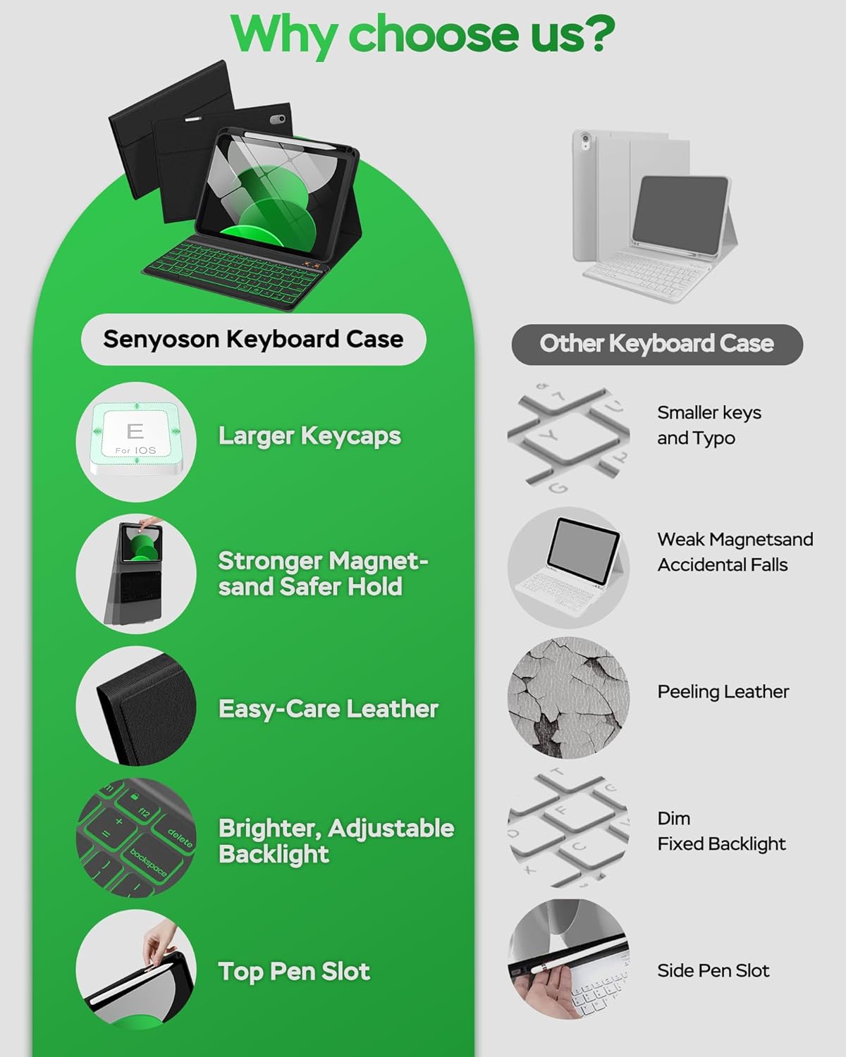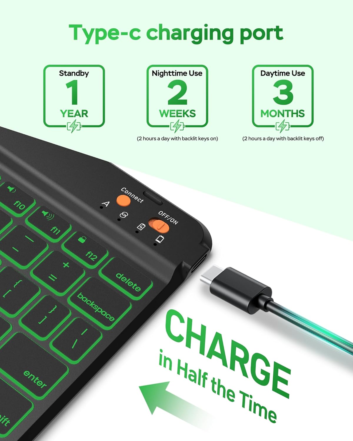 - Illuminate Your Typing: Enhance your iPad with a 7-color backlit keyboard and laser-etched keys. Perfect for any lighting, from late-night work to cozy cafés. Enjoy quiet, comfortable typing with customizable backlighting and ergonomic scissor-switch keys