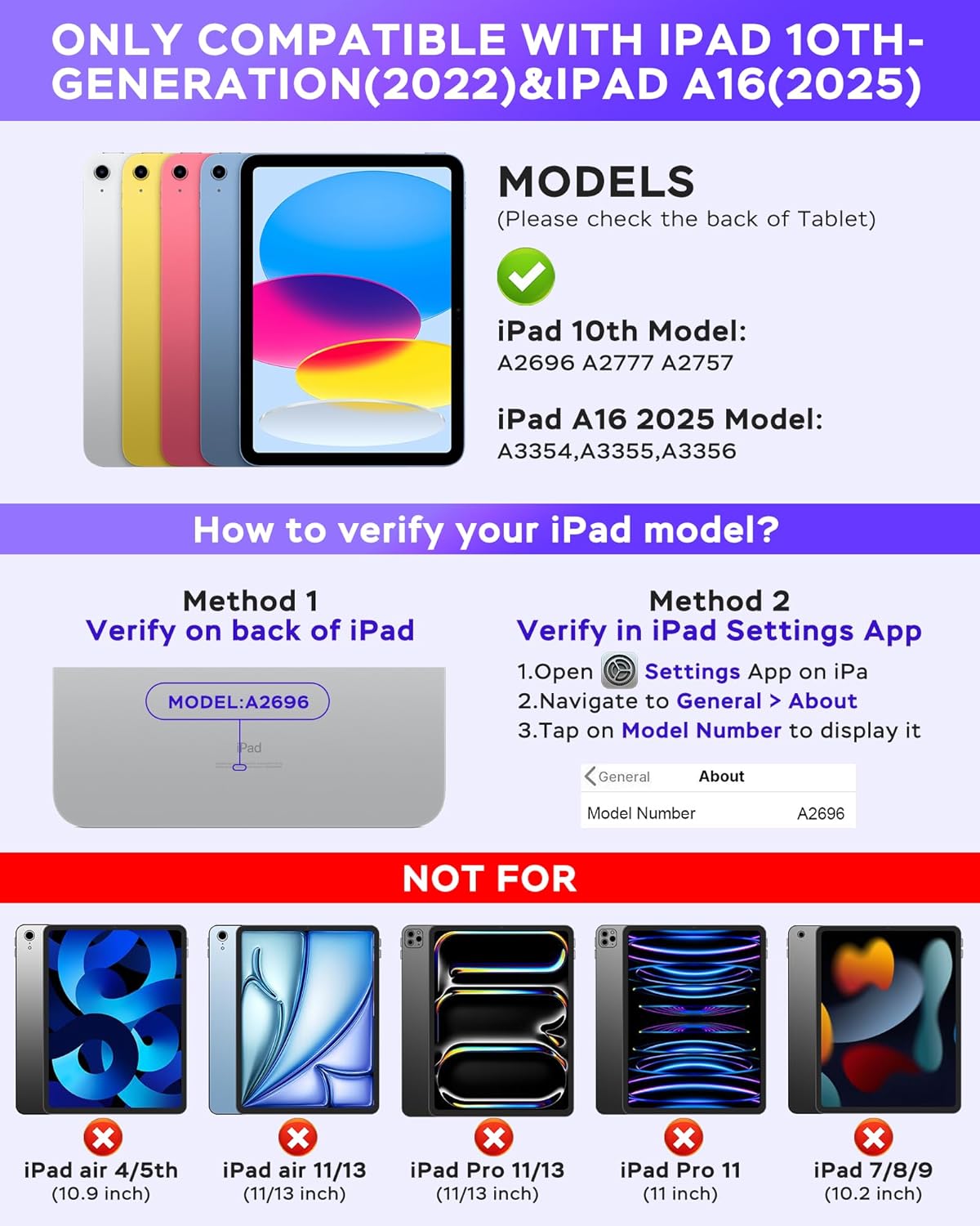- Compatibility: Designed for iPad 10th Generation (2022) 10.9-inch (Models: A2696, A2757, A2777) and iPad A16 (2025). Not compatible with other iPad models. Please check the model number on the back of your iPad to ensure a perfect fit