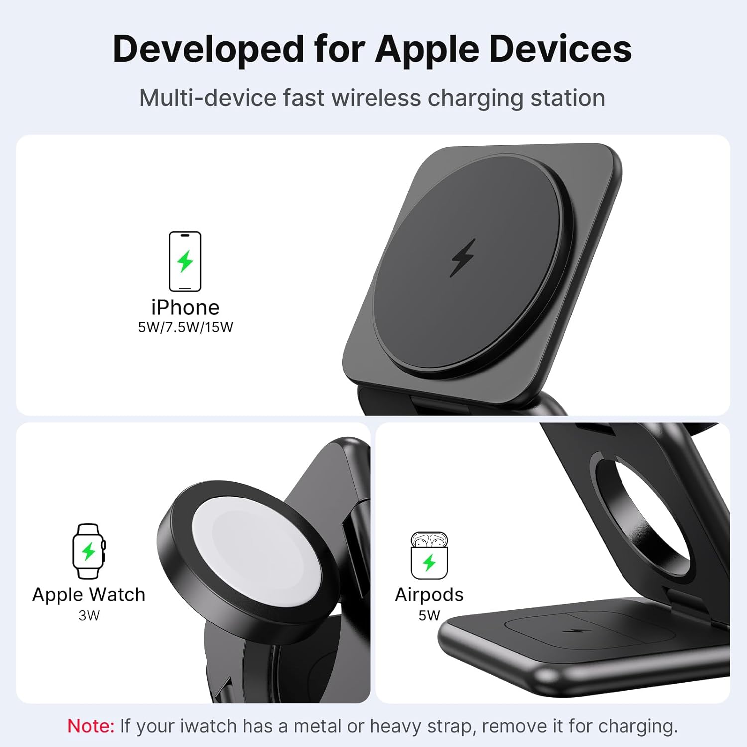 - Safe and Fast Charger for iPhone: 3 in 1 charger for iPhone charging station supports up to 15W of power output and offers multiple safety features, such as overcurrent, overvoltage, and overheating protection. The charging station for multiple devices apple protects the camera lens from scratches.(A slight warming of the charger during operation is normal)