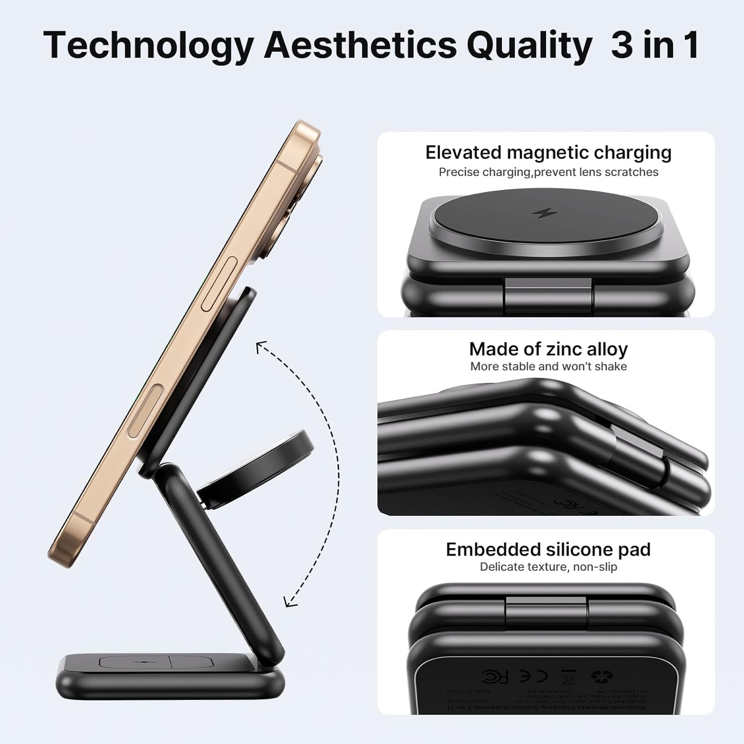 - Mag-safe and Stable: The mag-safe design of the iPhone charging station keeps your device secure during both horizontal and vertical charging. The sturdy zinc alloy body, stronger than plastic, and silicone pads provide stability and anti-slip protection, ensuring wobble-free use in stand mode