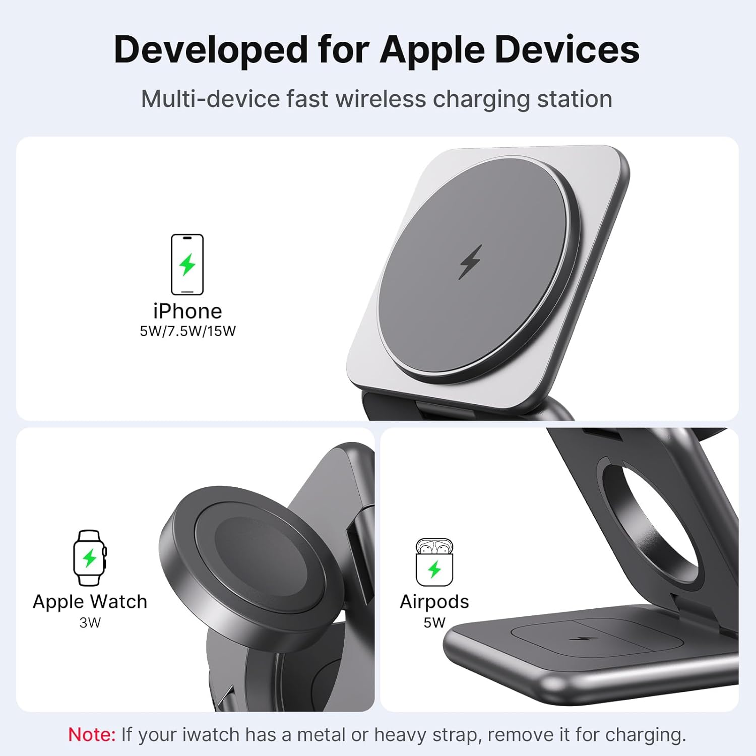 3 in 1 Charging Station for Apple Multiple Devices, Zinc Alloy Foldable Travel Wireless Charging pad for Mag-Safe Wireless Charger Stand for iPhone 16 15 14 13 12 Apple Watch Airpods