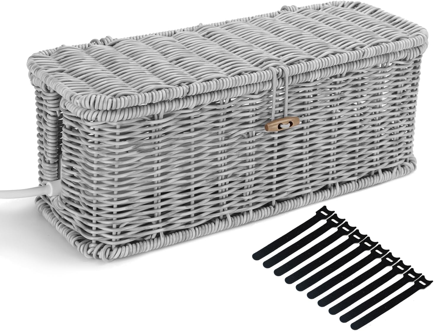 - Exquisite & Durable Woven Synthetic Rattan: Crafted from handwoven plastic rattan, this wicker style cord hider storage box combines durability with BOHO farmhouse charm. Its rattan decor texture adds warmth to any room, whether placed on desk or as a decorative storage box in your living room, kitchen, dining room, toilet or bedroom. Easy to clean and durable, it’s ideal for home office organization or hidden storage solutions.