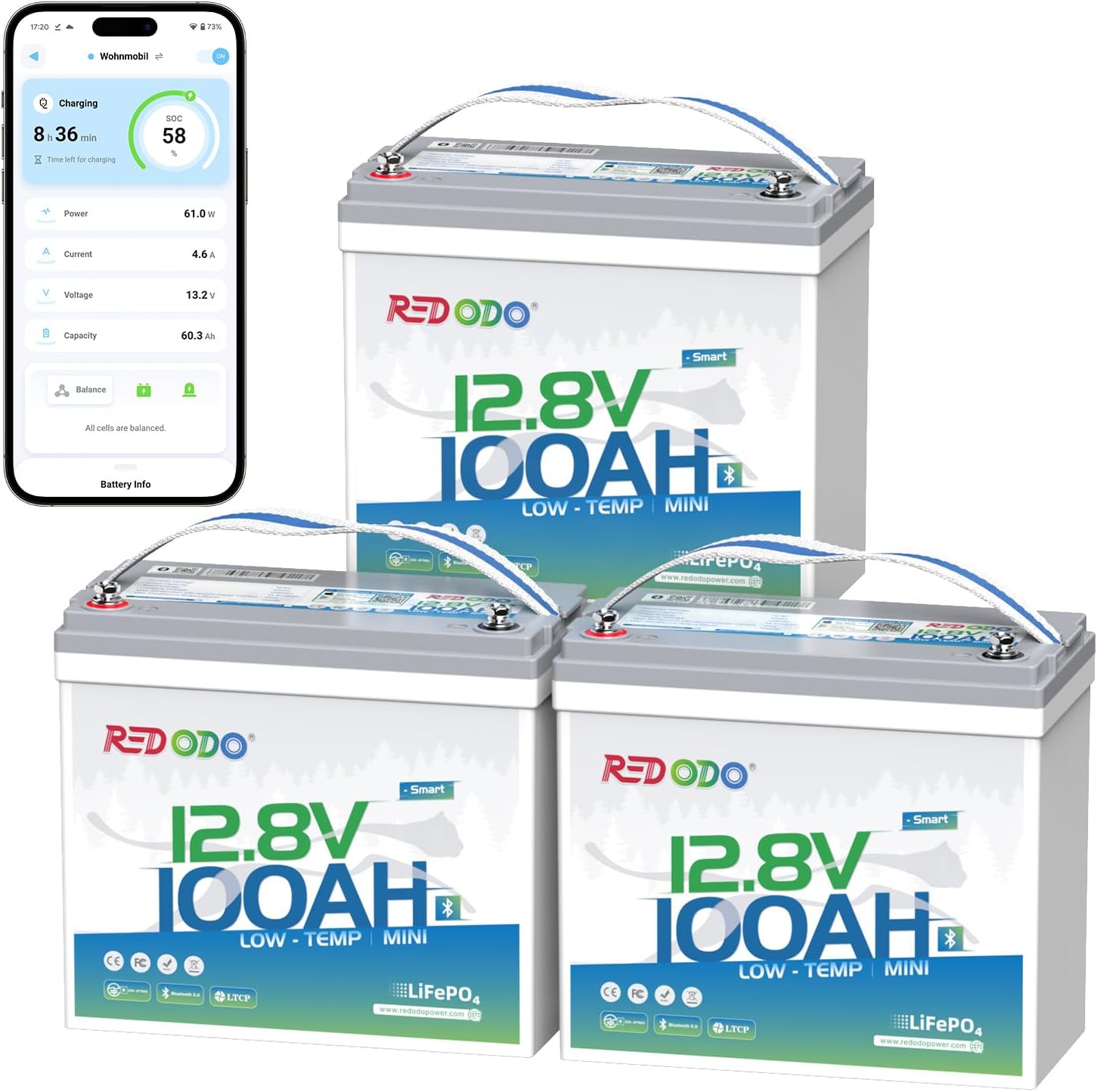 - 【ULTRA-RELIABLE ALL-ROUND SAFETY】The Redodo MINI 100Ah LiFePO4 battery, equipped with an upgraded 100A BMS, safeguards against overcharge, over-discharge, overcurrent, short circuit, and high temperature, while also featuring low-temperature protection. The 12V 100Ah MINI battery comes with a custom Redodo casing, a portable handle, IP65 rating, and a matte surface, effectively shielding your battery from dust and water splashes. Wherever you go, it serves as a reliable, portable, and safe companion.