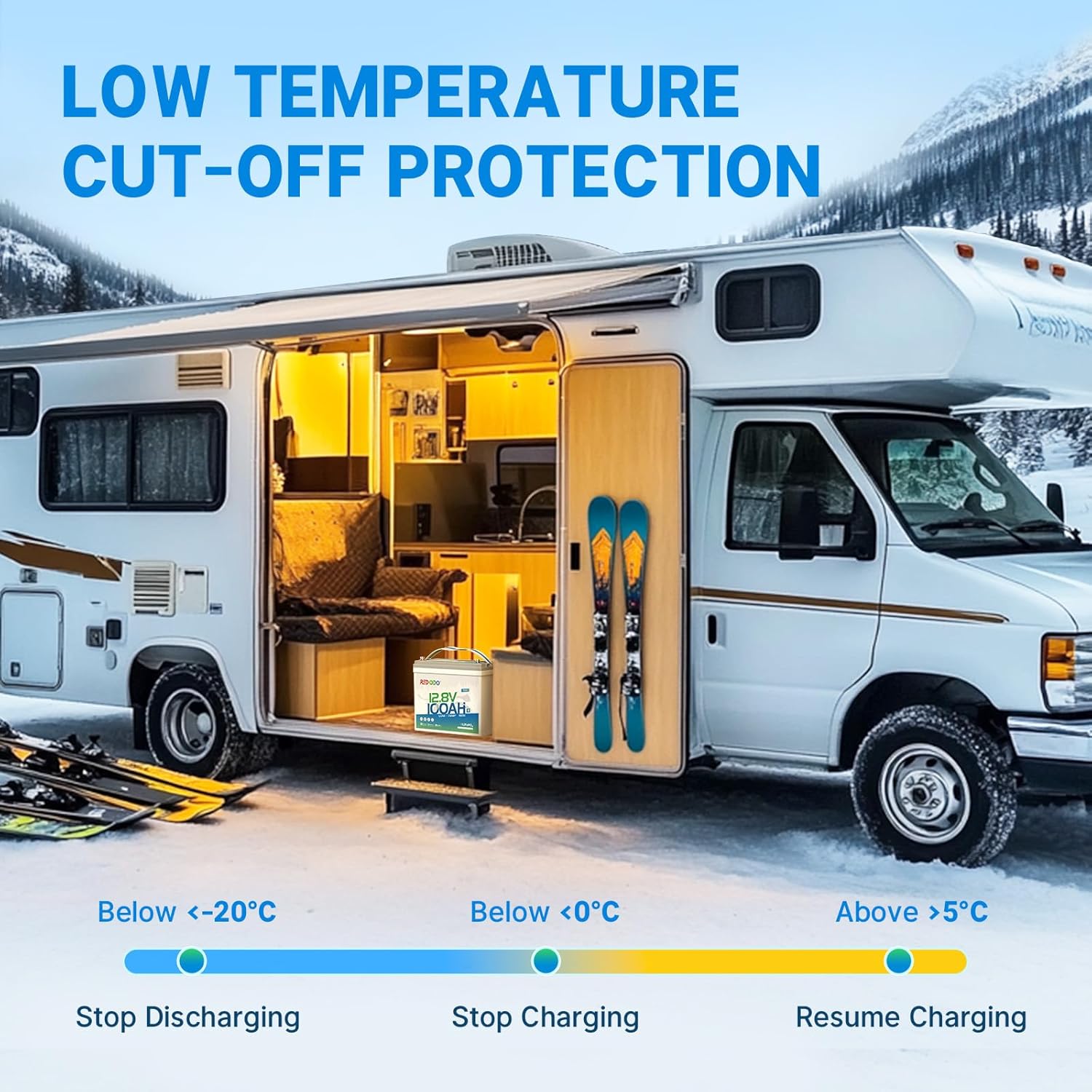 - 【LOW TEMPERATURE CUT OFF PROTECTION】Redodo 12V 100Ah LiFePO4 lithium battery supports low temp cut off function, which can stop battery charging when it detects that the temperature of the battery is below 32°F, while it resumes charging when it detects that the temperature of the battery is above 41