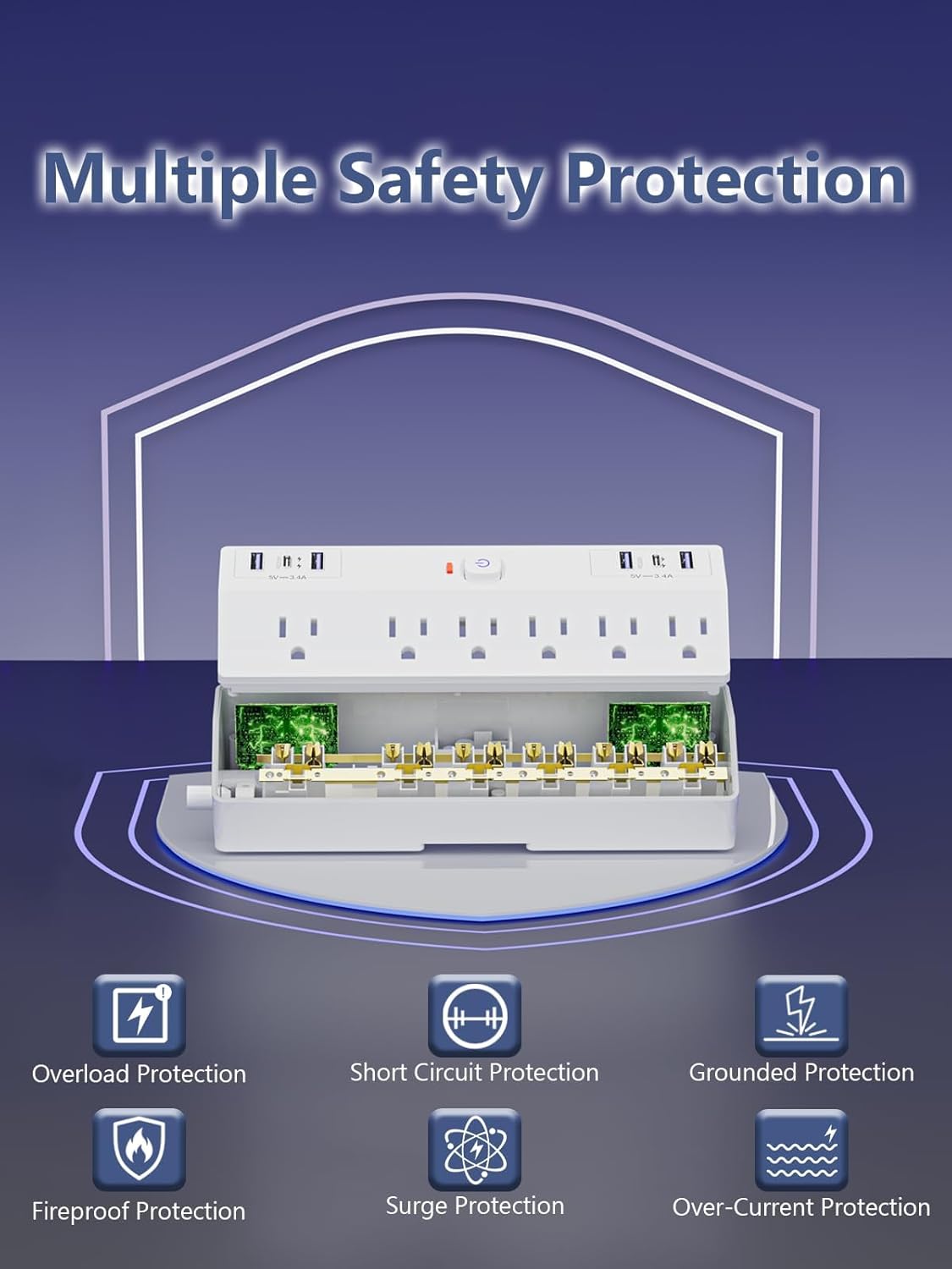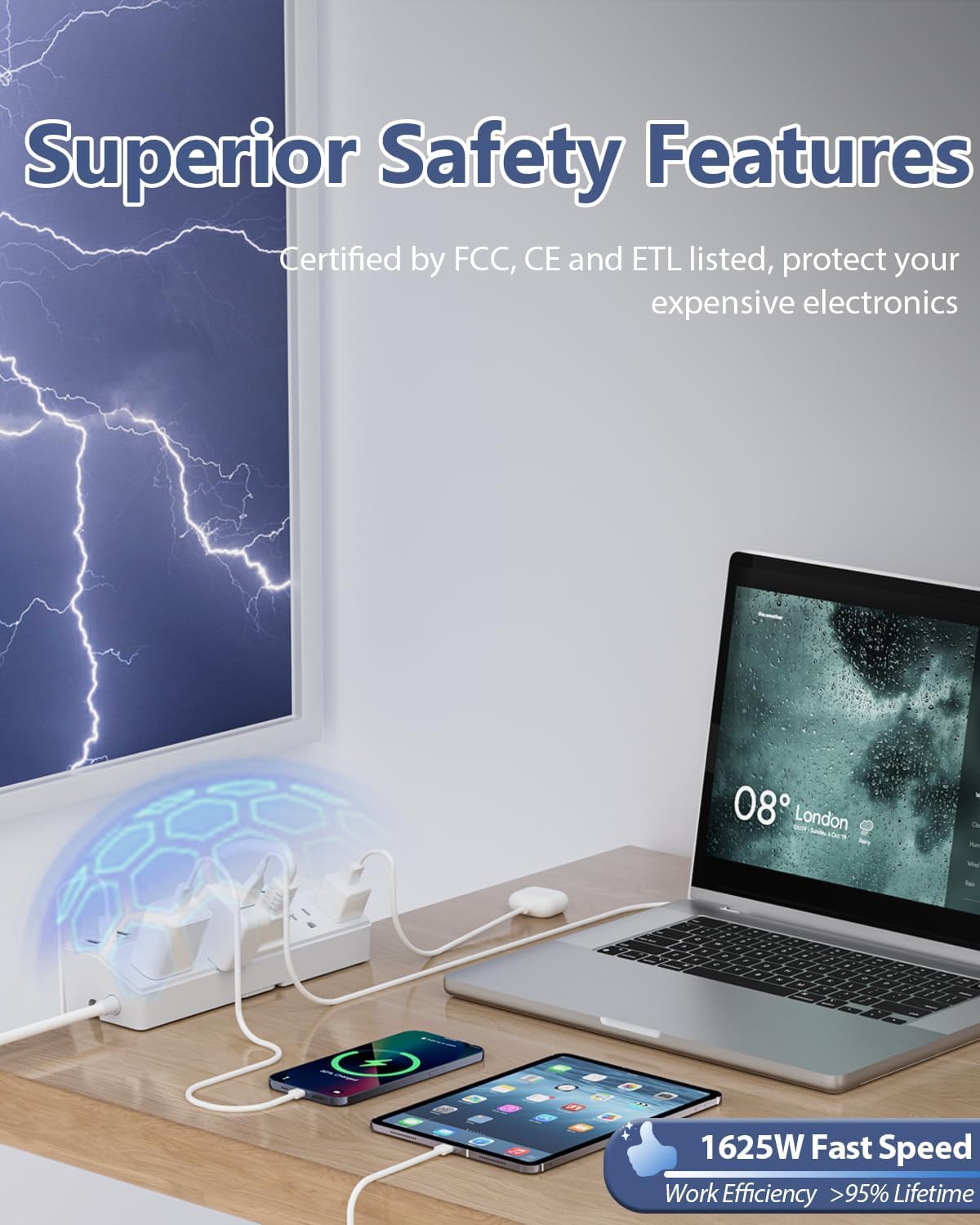 - 【High Quality Material & Surge Protection】-Desk power strip surge protector is made of 1382°F heat-retardant ABS+PC material. It provides 1625W overload protection (the red button on the side) and 1800J surge protector, and also has FCC and CE safety certifications, and major components such as extension cords have passed UL certification, ensure your electricity safety.