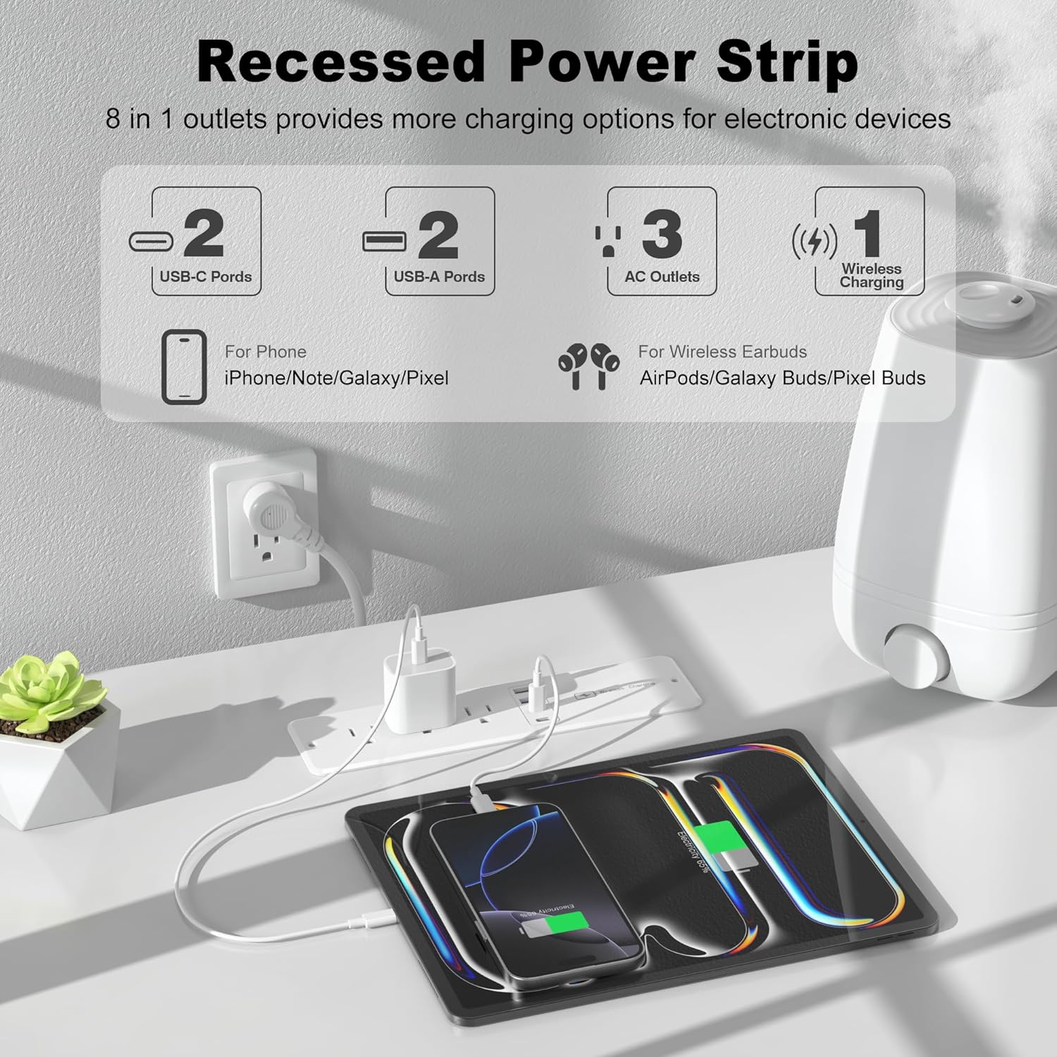 8 in 1 Recessed Power Strip with 15W Wireless Charger, 20W Fast Charging Furniture Outlet, Plug in 3 AC Outlets & 4 USB Ports Flush Mount, 10FT Cord