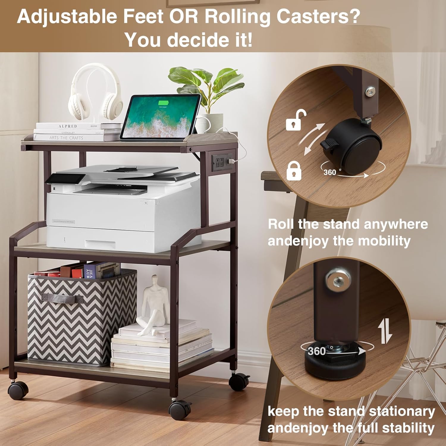 Lauren&Harold 34'' Printer Stand with Power Outlets & USB Ports, 3-Tier Adjustable Rolling Cart, Heavy Duty 150LBS Storage Table with Wheels for Office, Kitchen, Living Room, Grey/Bronze
