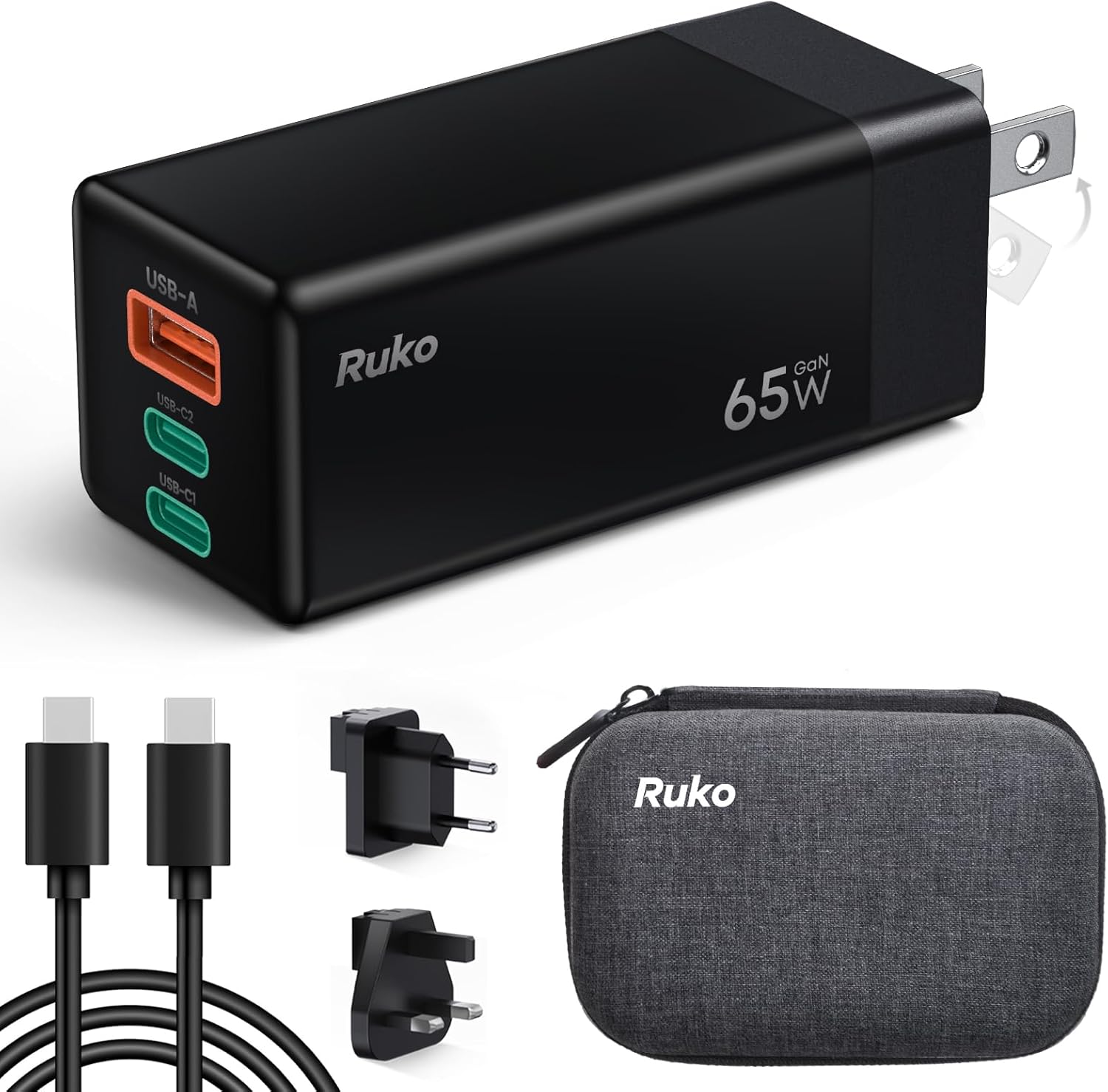 - [Perfect for On-the-Go] Ruko 65W USB C Charger Kit is your perfect travel companion, featuring a compact carry bag, a 4ft USB-C to USB-C cable, and two converters (UK/EU). With support for universal 100-240V voltage, it ensures seamless adaptability and portability for global travel.