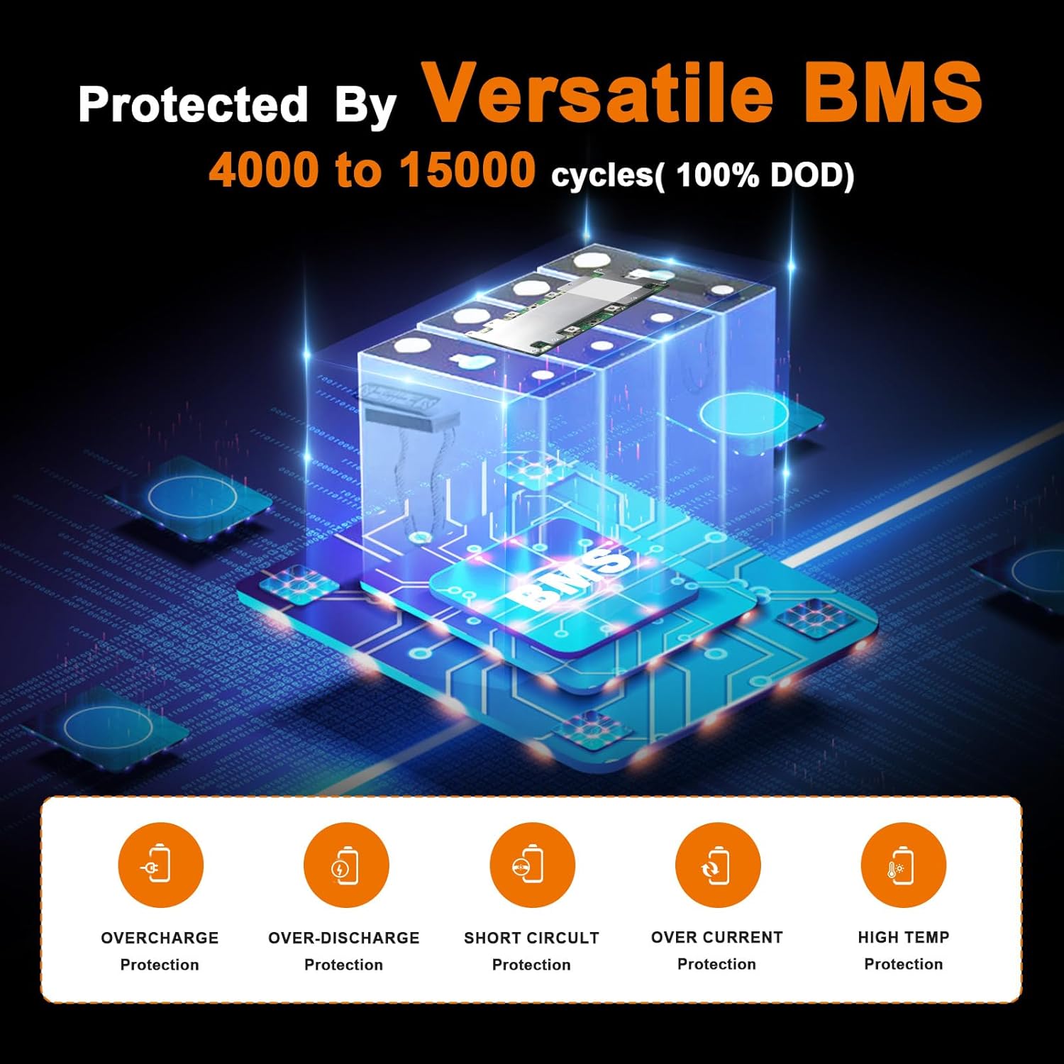 - 【Super safe to use】12V 300Ah LiFepo4 battery will not burn when overcharged, over-discharged, over-current or short circuit, and can withstand high temperatures without decomposition. Built-in 200A BMS can handle cell balancing, low & high voltage cutoff, short circuit protection and temperature protection. Without memory effect, no matter what state the battery is, it can be used as soon as it is charged.