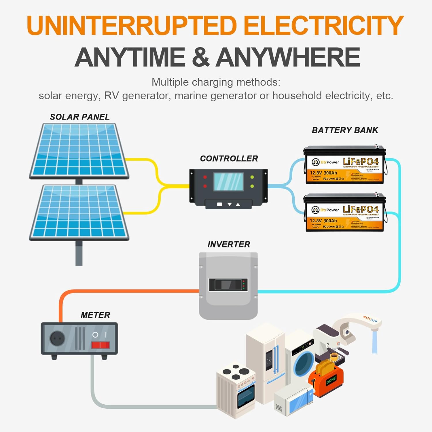 12V 300Ah Lithium Battery LiFePO4 Deep Cycle Battery,200A BMS,Up to 15000 Cycles,Perfect for RV, Home Storage,Marine,Solar Power System and Outdoor Camping.