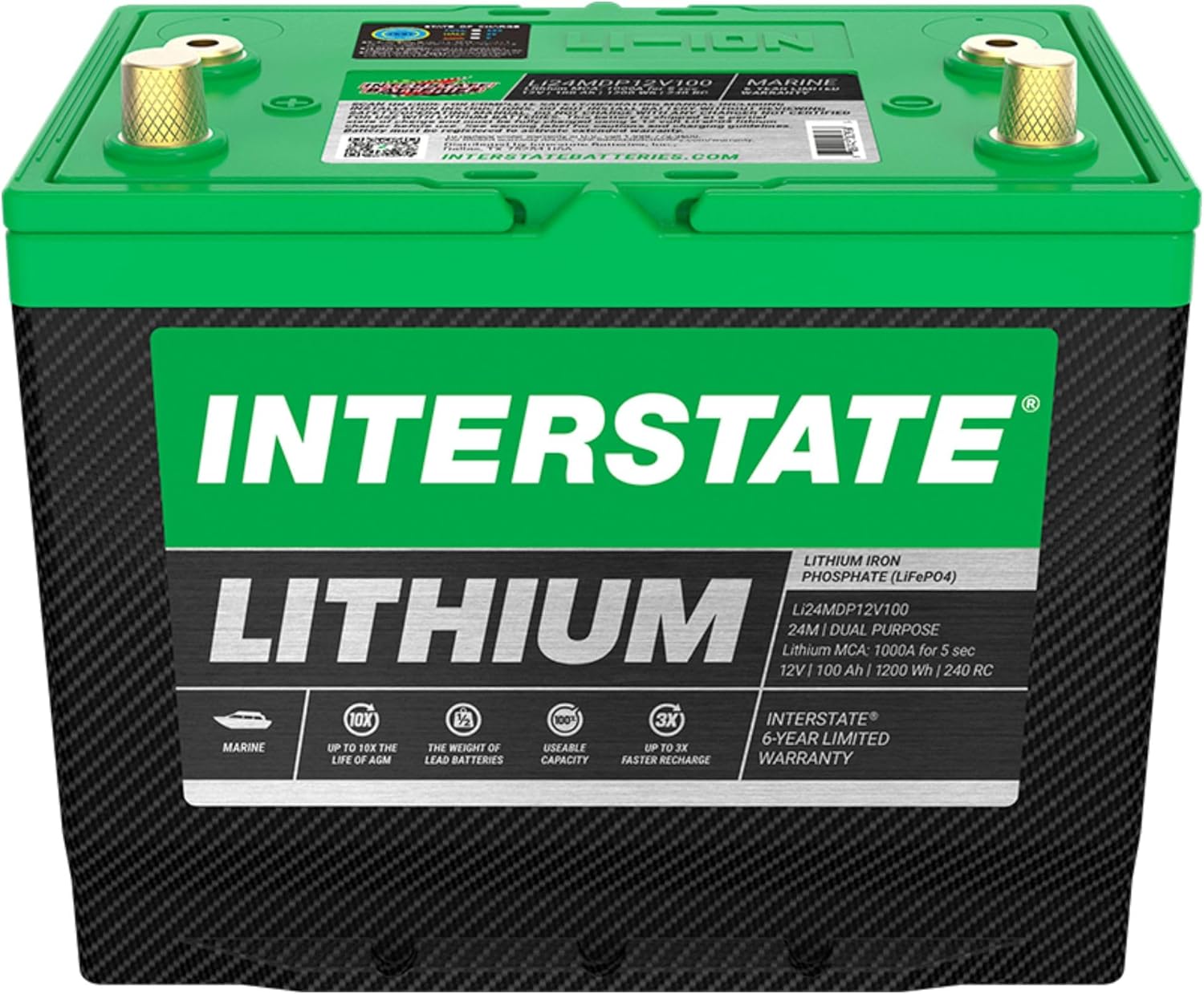 Interstate Batteries 12V 100Ah Group Size 24M Lithium Marine Dual Purpose Deep Cycle LiFePO4 Battery, Maintenance Free, Lightweight, Ideal For Boats with 1,000 Marine Cranking Amps (Li24MDP12V100)