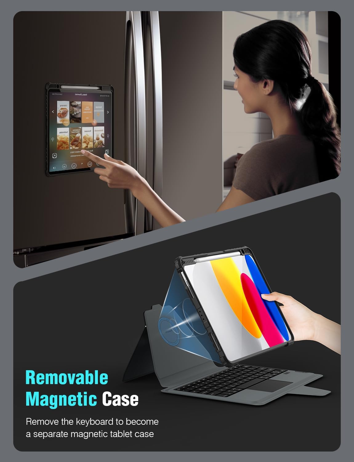 - 【DESIGNED FOR COMFORT】 — This ipad case 10th generation features a magnetic ring attachment design for smooth, adjustable viewing angles. Can also be turned into a separate magnetic case when detached from the keyboard, for more flexibility, and use the magnetic case alone for all the places you can magnetize, like your home refrigerator!