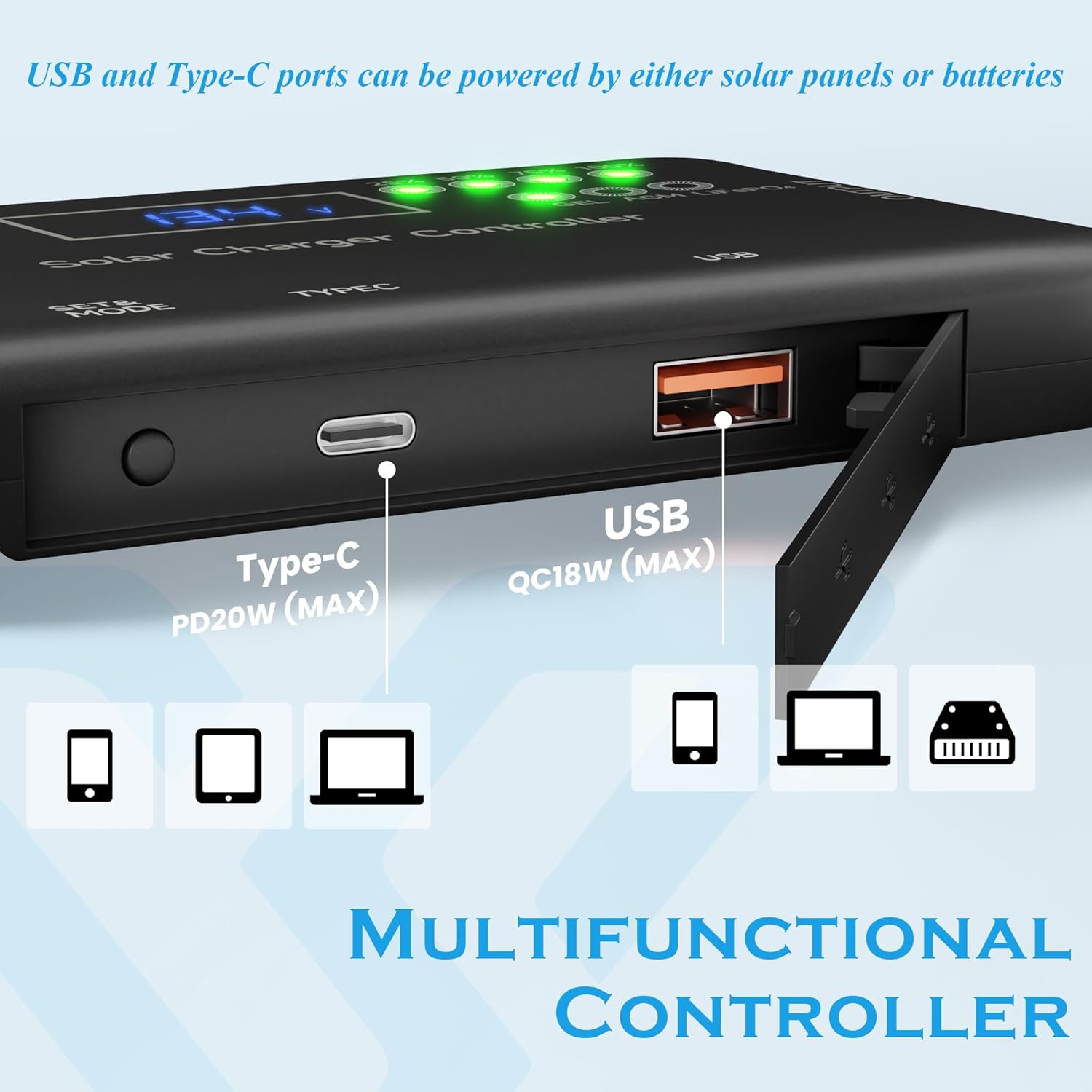 - Upgrade Charging Controller: The LCD display and charging status bar can reflect charging data and progress in real time, The Type-C and USB interfaces cover more charging objects, The memory function spares the need for secondary settings