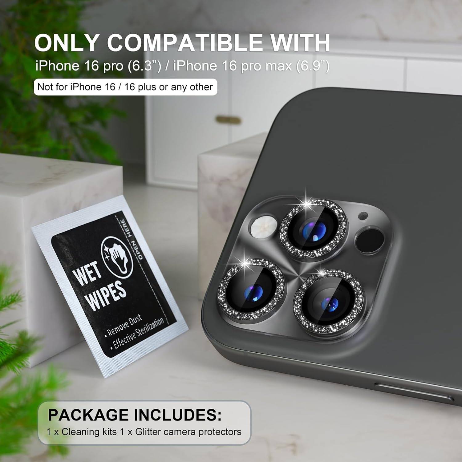 - Bling Camera Lens Protector: We present new upgrade smartphone rear camera lens Protectors which are perfectly compatible for iPhone 16 Pro Max 6.9-inch & iPhone 16 Pro 6.3-inch 2024 released. The package contains a set of delicate camera lens protectors and a set of cleaning kits. Please confirm the iPhone models carefully before purchase.
