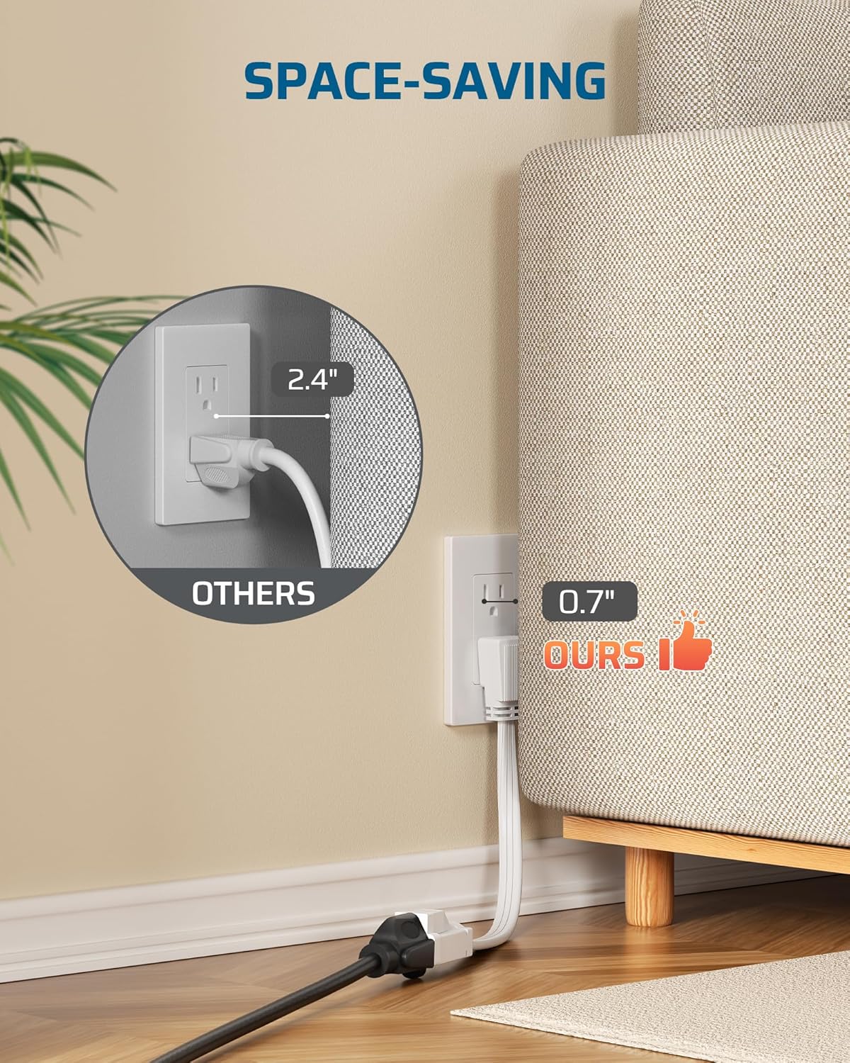 - [Space-Saving Flat Plug] Designed with a flat plug and slim cable, this 1 foot extension cord fits easily in tight spaces and lays flush behind desks, sofas, bookshelves, and kitchen appliances, keeping your area neat and organized