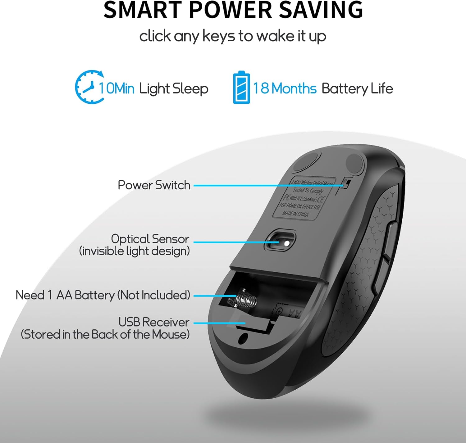 - 【Long Battery Life & Auto Power Saving】 - Combined with a power-saving mode and on/off switch, this efficiently engineered mouse grants you up to 18 months of battery life. The mouse is powered by 1 AA battery (not included), and it will turn to sleep mode in 10mins of inactivity for energy saving, can be easily activated by clicking any buttons.