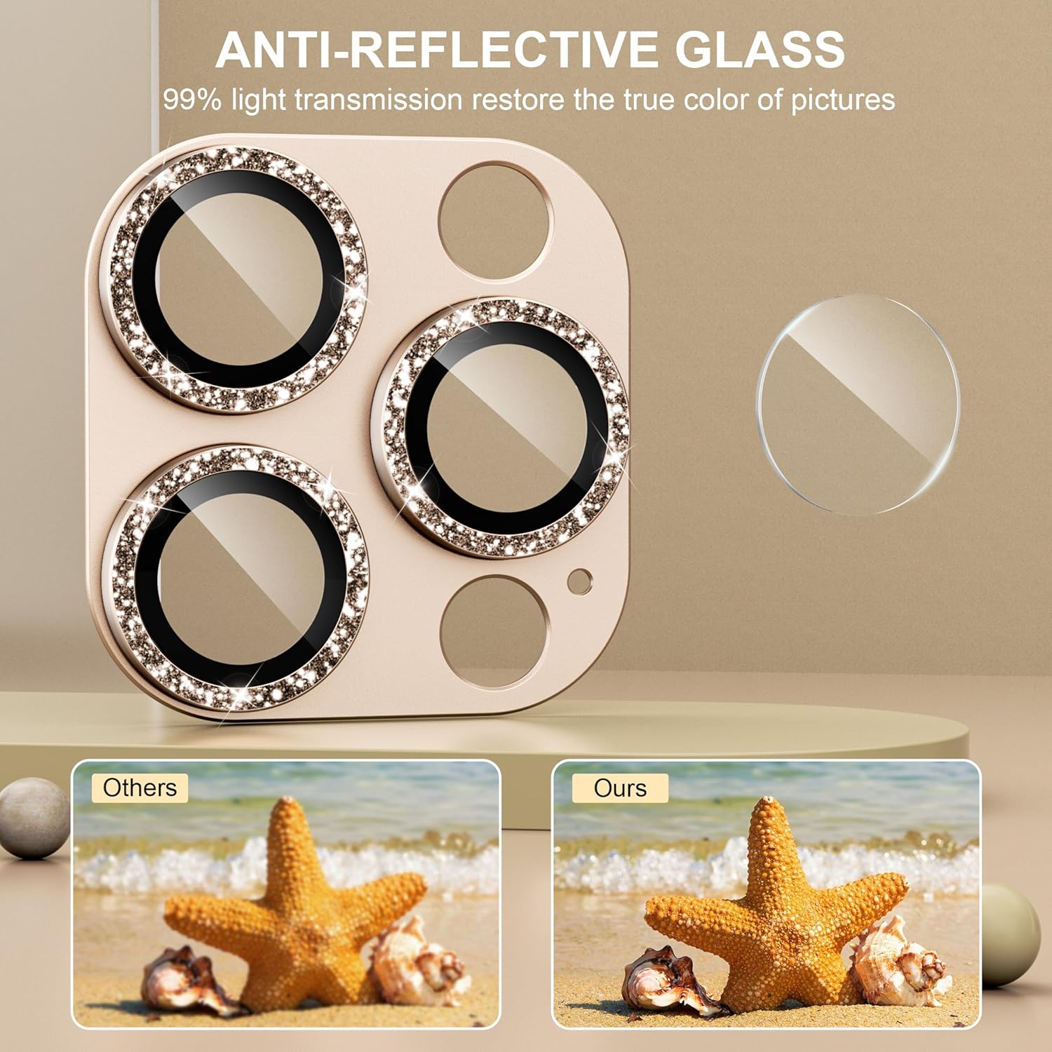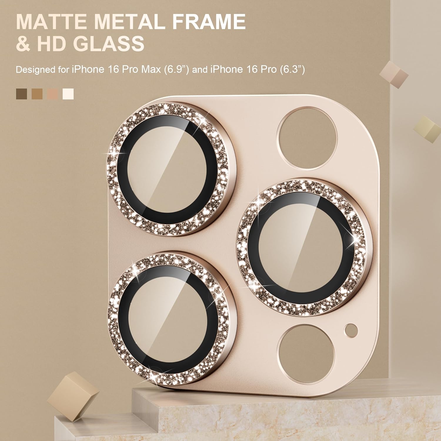 beuxece Compatible for iPhone 16 Pro/iPhone 16 Pro Max Camera Lens Protector, Bling Metal Tempered Glass Camera Screen Cover Accessories [Strong Adsorption][Case-Friendly]- Glitter Titanium Desert