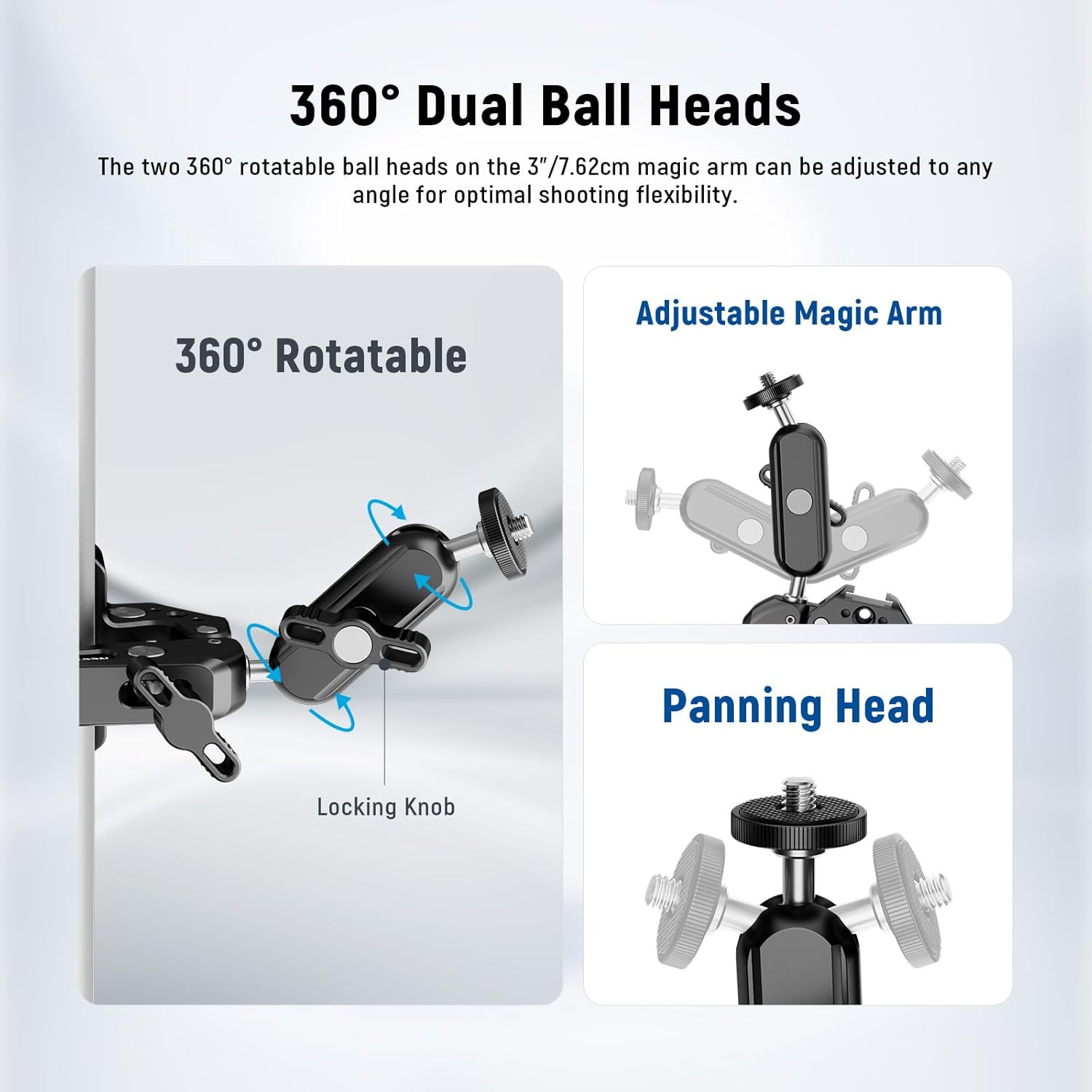 - 【360° Dual Ball Head Flexible Angles】 The two 360° rotatable ball heads on the 3"/7.62cm magic arm can be adjusted to any angle for optimal shooting flexibility. The screw knob enables quick and easy fastening of the ball heads. The 1/4" mounting screw is for DSLR and mirrorless cameras, LED video lights, microphones, monitors (compatible with Atomos Ninja V), phone holders, action camera adapters, etc.