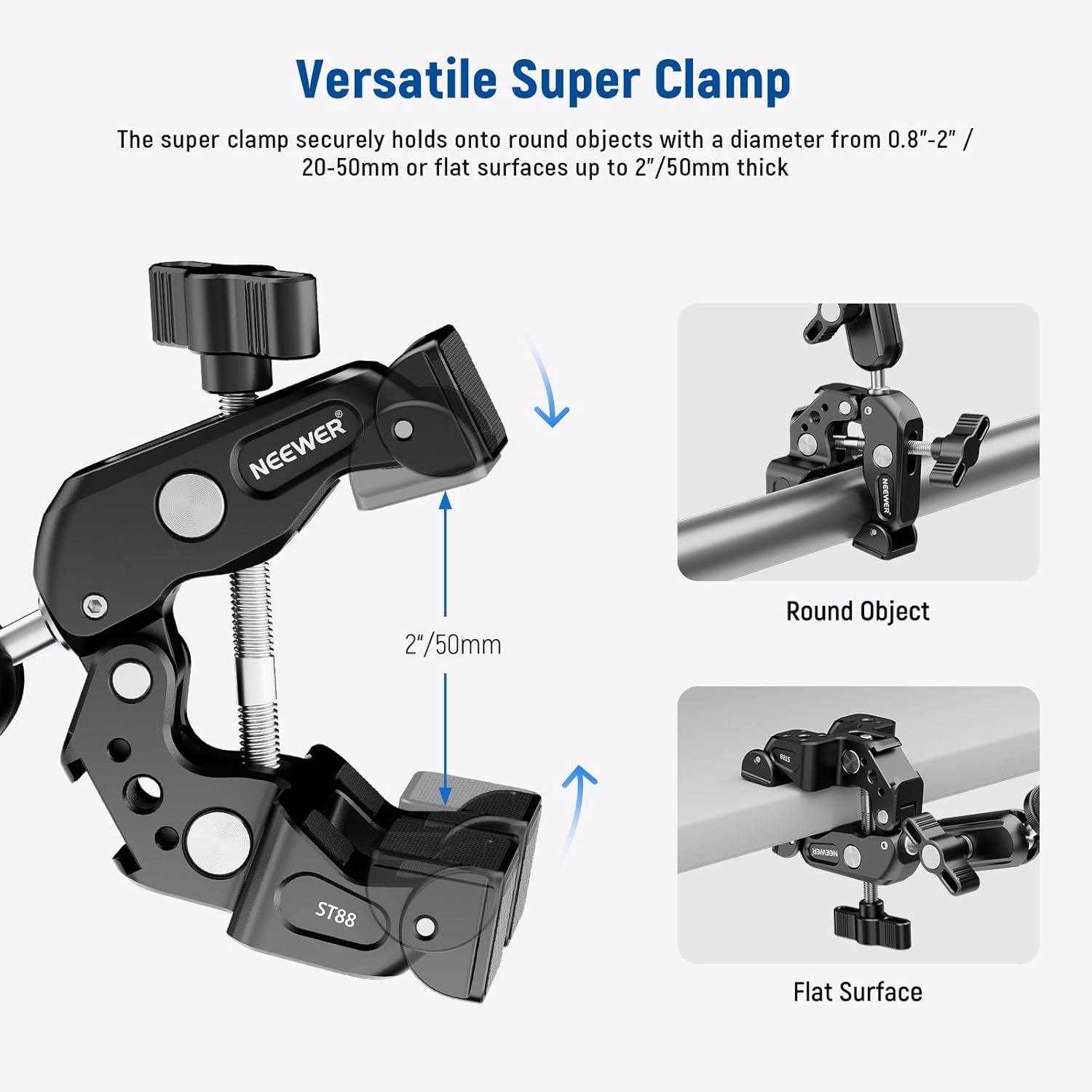NEEWER Super Clamp with 3" Dual Ballhead Magic Arm, Camera Phone Clamp Mount with 1/4" 3/8" Threads, Cold Shoe, Phone Holder, Action Camera Adapter Compatible with GoPro DJI iPhone 16 15 Pro Max, ST88