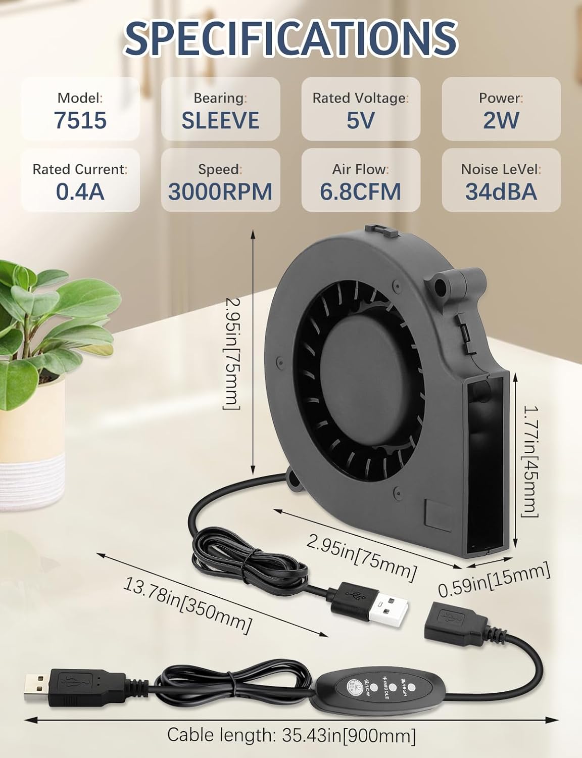 - SPECIFICATION of Variable Speed Flat Fan: 75 x 75 x 15 mm (2.95 x 2.95 x 0.59 inch) | Rated Voltage/Current: 5V 0.4A | Speed: 3000 RPM | Air flow: 6.83 CFM | Noise: 34 dBA | Power: 2 Watt | Connector: USB-A | Bearings: Sleeve | Air Pressure:0.53 In H2O