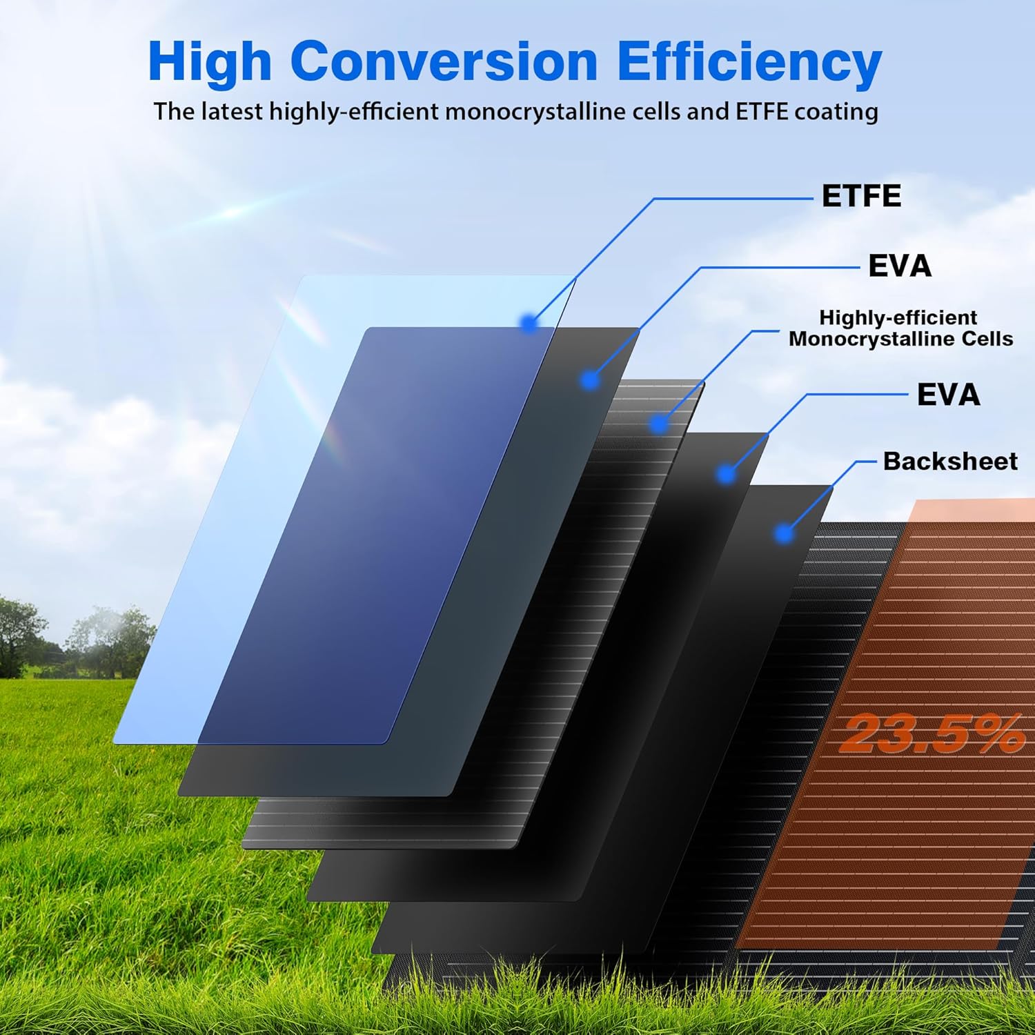 - High Solar Conversion Efficiency Up To 23.5%!!! This portable solar panel uses the latest highly-efficient monocrystalline solar cells that convert the sunlight efficiently into clean energy with high conversion efficiency of up to 23.5%!