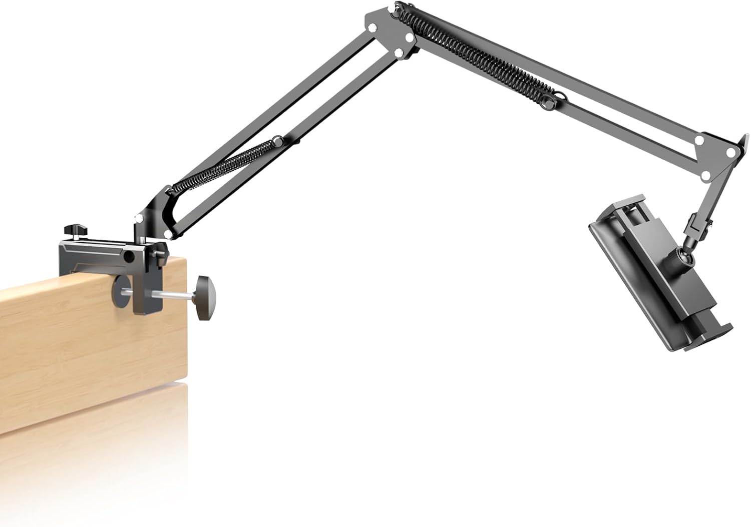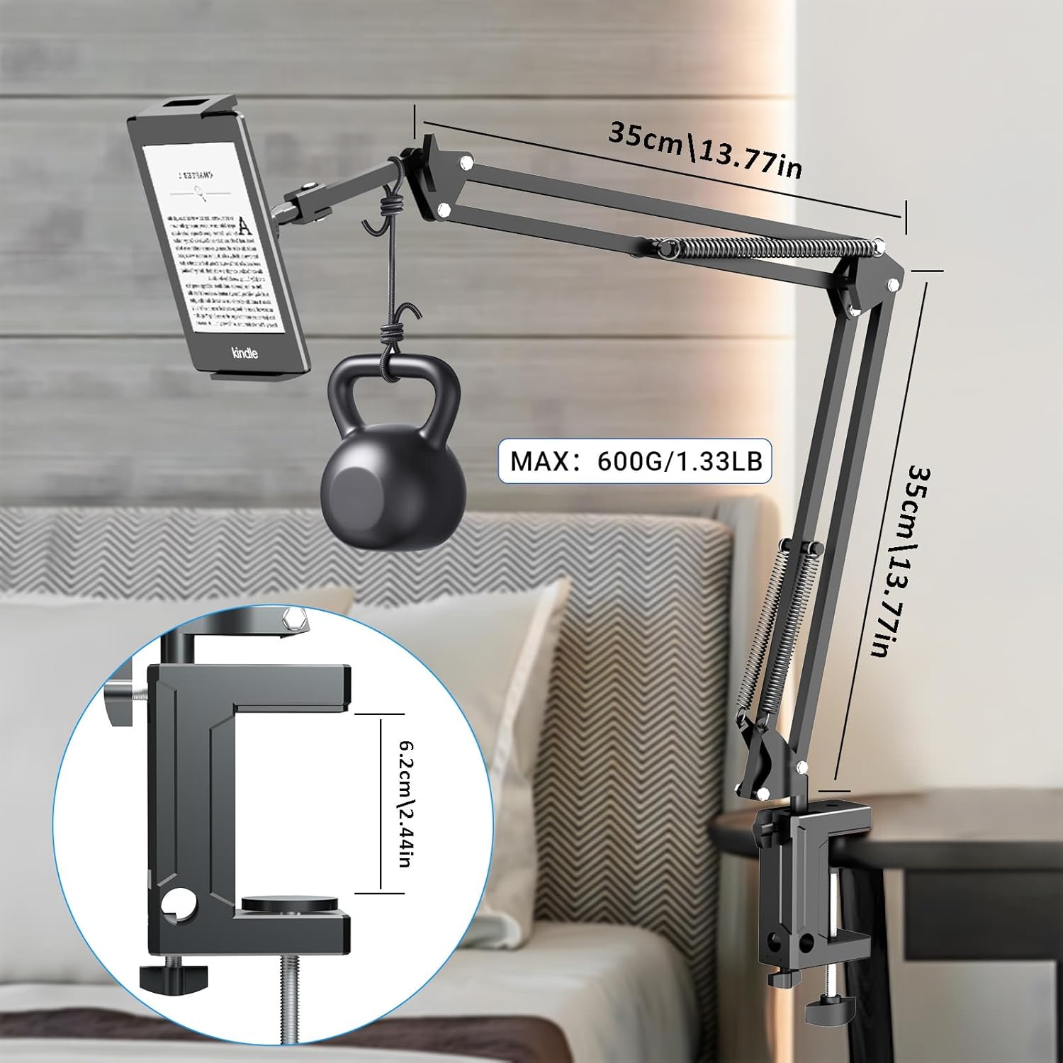 - [ Durable & Robust ] Different from other plastic gooseneck holder, ours is made of metal which is much more durable and sturdy. The clamp can max clip 2.5in/6.2cm thickness which can mount to most headboard, desk or table bedside; In addition, the base has 2 holes for the arm, then can use it for both desk mode and bed mode