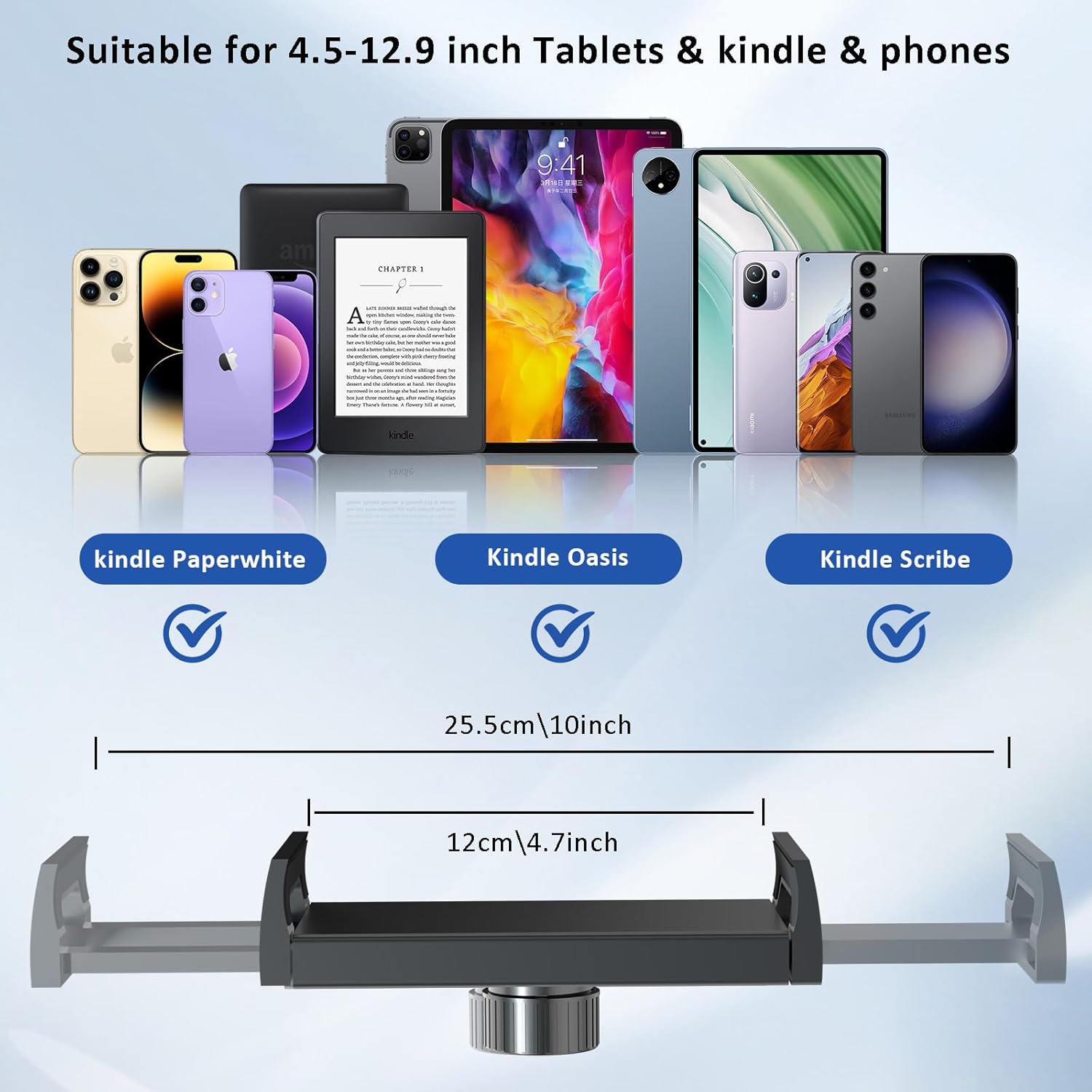 - [ Compatible with Phone and Tablet ] The width of this clip can extend from 4.7''/12cm to 7.8''/20cm, suiltable for most 4.7 inch to 11 inch phone/tablet/Kindle. Such as: Kindle Paperwhite, Kindle Oasis, Kindle Scribe, Kindle 10 etc iPad Air 2 3 4, iPad mini 7.9 inch 2 3 4 generation, iPad Pro 9. 7 10. 5, iPad 9. 7 2018 / 2017, New iPad Pro 11, All iPhone, Galaxy S10e S10+ S10 S9+ S9 S8+ S8 S7 Edge Note 9 8, LG,Google Pixel,etc.