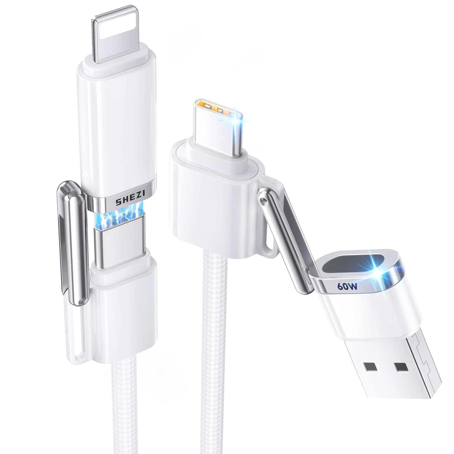- 【Applestyle 4-in-1 Charging Cable】Sleek Design, Zero Clutter: Simplify life with SHEZI 4 in 1 Appleinspired flat braided charger cable—crafted for minimalist lovers. Seamlessly charge iPhone 16/15/14, iPad, MacBook, and Samsung via 4 ports (USB-C/Light-ning/USB-A). A desk accessory that blends beauty and function lets you pride in organized spaces
