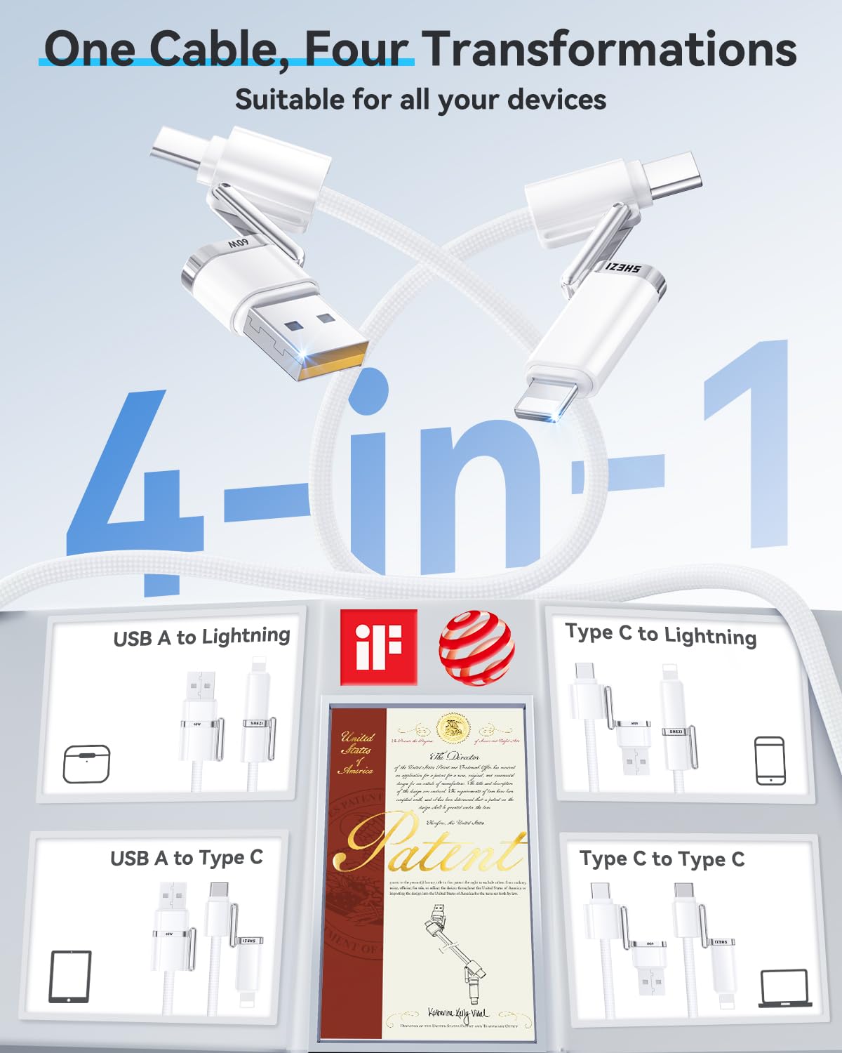 SHEZI 4-in-1 USB C Cable Compatible With Lightning Cable 60W Fast Charging & Data Transfer, Support to CarPlay & Android Auto, 5FT Travel Multi Cord Charger Combo for iPhone/iPad/Samsung/MacBook Cable