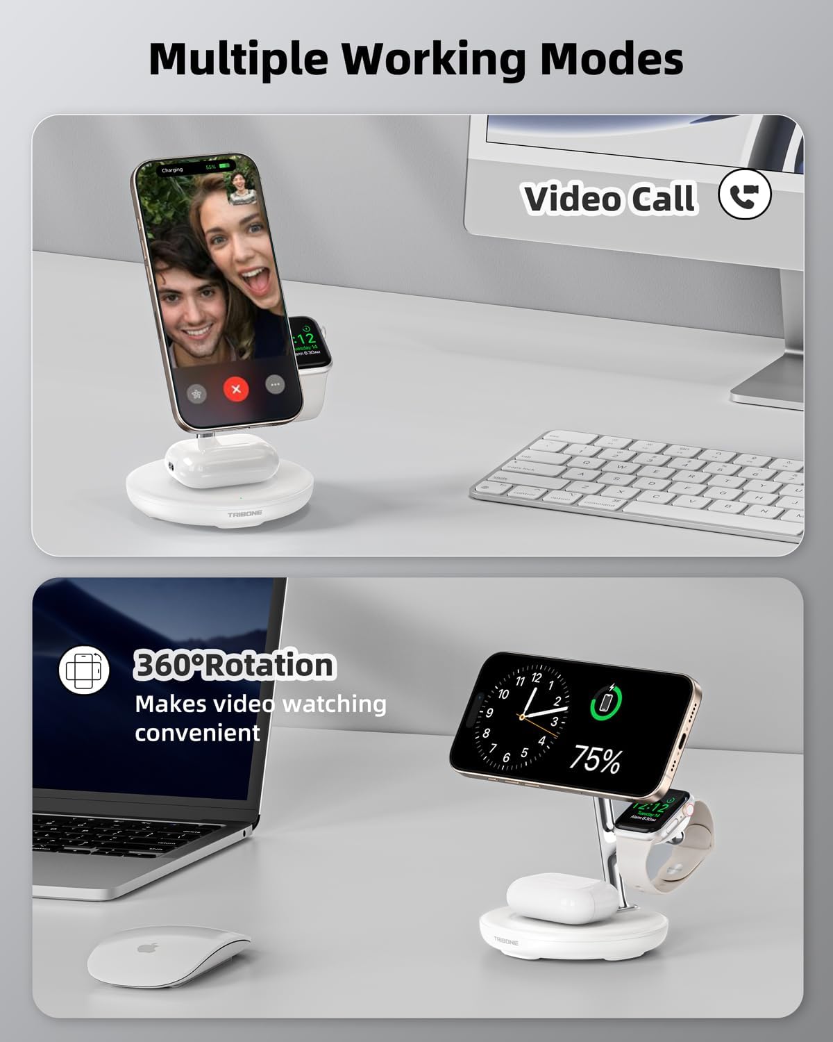 3 in 1 Magnetic Wireless Charger Stand for Apple Devices, TRIBONE Fast Charging Station for iPhone 16/15/14/13/12 Series, Apple Watch, Airpods (White)