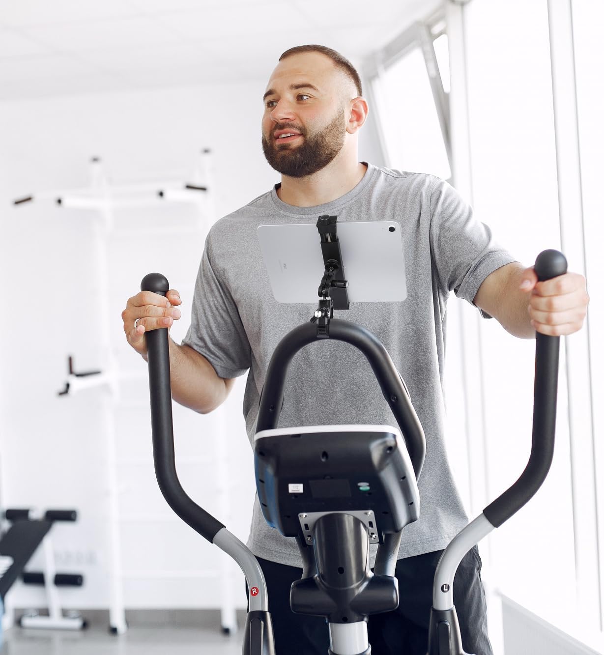 - **Versatile Super Clamp**: Constructed from robust aluminum alloy, this tablet mount securely attaches to cylindrical objects with diameters ranging from 0.5" to 2". Perfect for use with baby strollers, treadmills, ellipticals, spin bikes, shopping carts, wheelchairs, music stands, and stationary bikes.