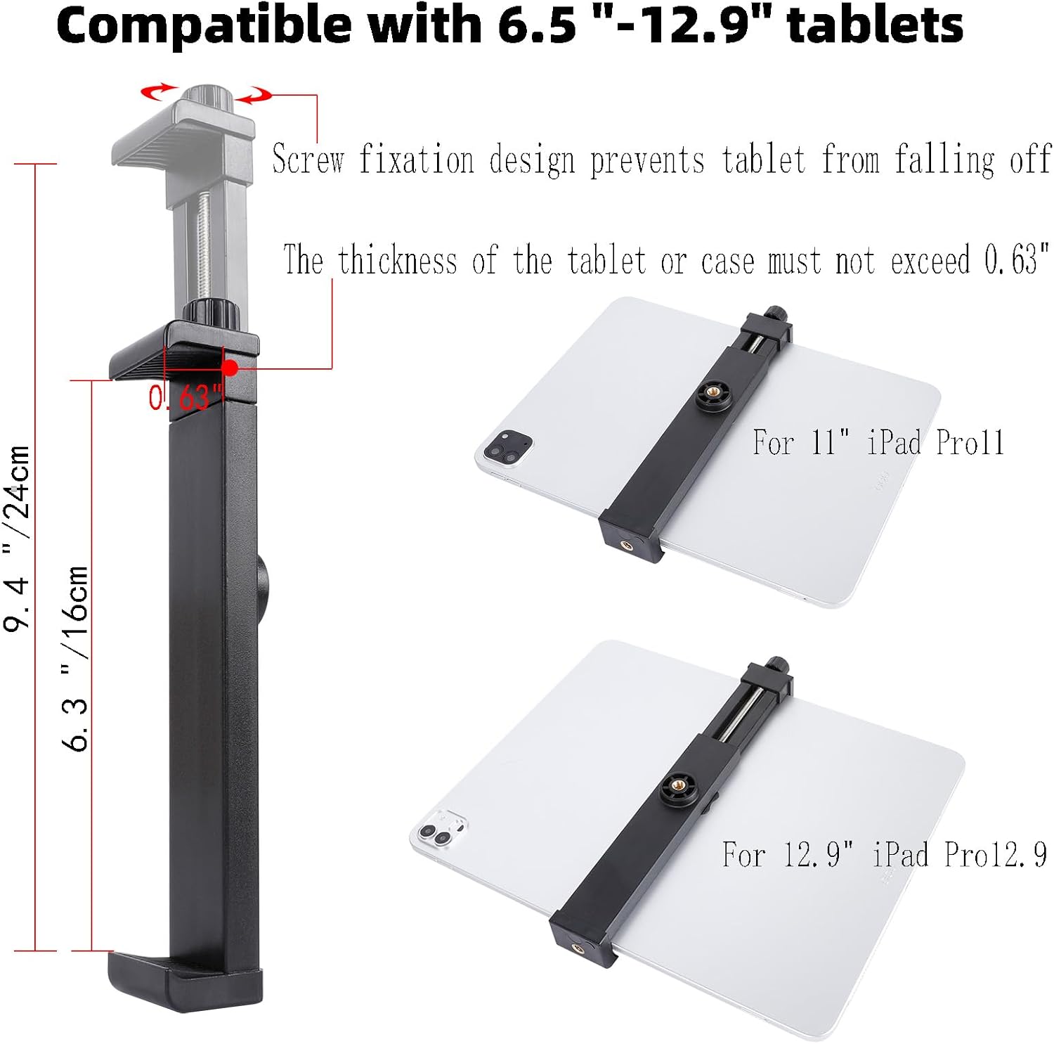 - **Universal Compatibility**: This Tablet Holder is designed to accommodate screen sizes from 6.5" to 13", compatible with iPad Pro 12.9, Air, Mini, and more, ensuring you can enjoy your media anywhere.