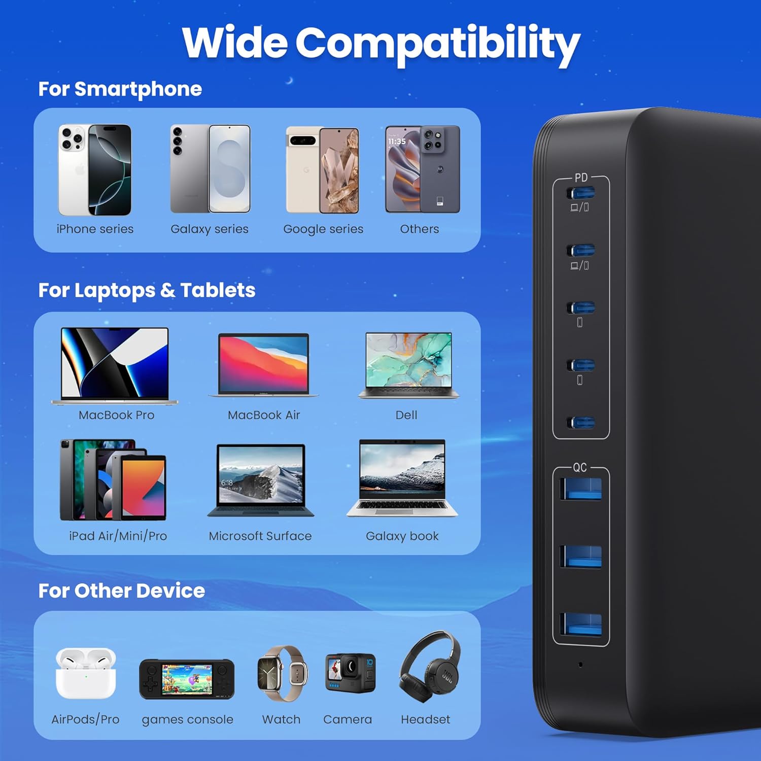 - 【USB C Laptop Charger Fast-Speed Charging】 It with total 415 watt power,Our charger has 8 ports, 5 USB C ports and 3 USB A ports, it compatible with all USB devices.Our feature is that our C1 and C2 single interface output is 100W, and we can charge two computers and 6 other devices at the same time.USB C Charger Compatible with iPhone Series ,Samsung Phones,Smartphone, Tablet, and Laptop, Work For MacBook Pro 13''/ MacBook Pro MacBook Air MacBook etc
