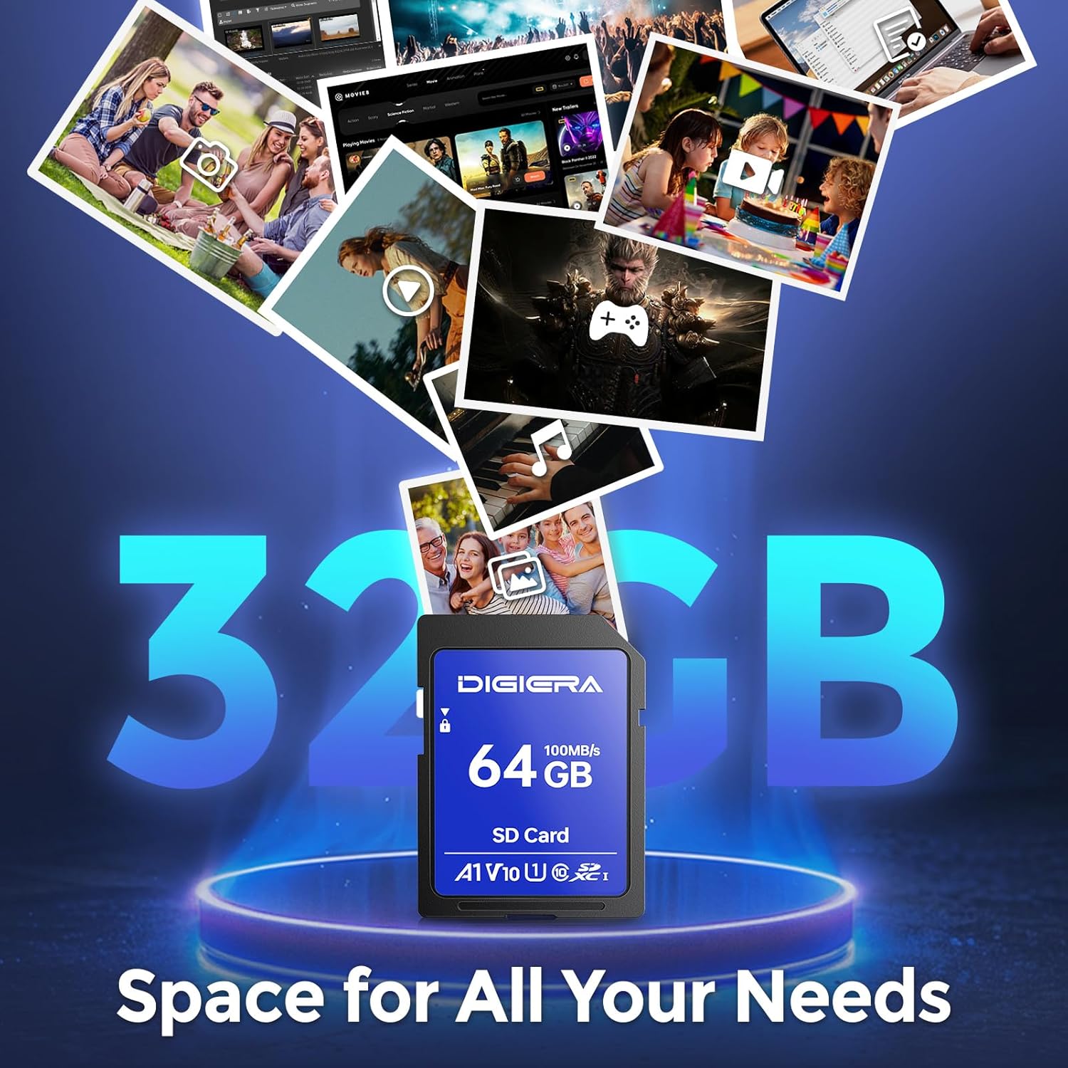 - 64GB Versatile Storage: With 64GB of storage space, the DIGIERA memory card holds approximately 12,000 high-resolution photos or 6+ hours of Full HD video. Due to different capacity algorithms and partial capacity used for system files, management, and performance optimization, the available capacity may be less than the identified capacity