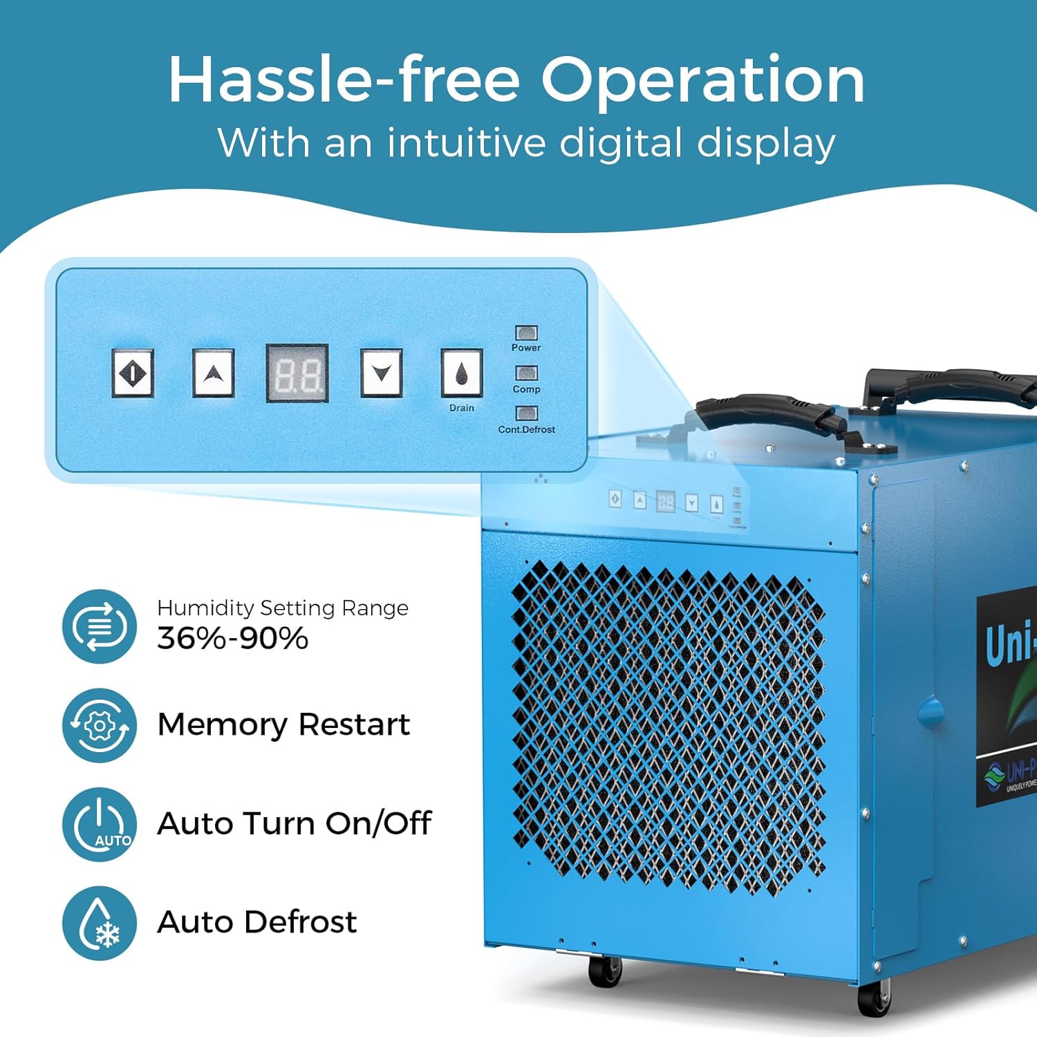 - Smart Humidity Control & Automatic Restart – Easily set your desired humidity level (35-90% RH) for continuous moisture control. The unit automatically shuts off when the target humidity is reached and restarts when levels rise again. With auto-restart memory, it resumes operation after power outages