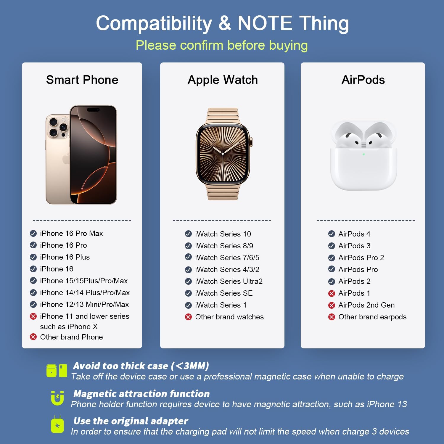 - Extreme Speed 3 in 1 Wireless Charger: You can charge your apple products simultaneously through this 3-in-1 wireless charging station. It charges your iPhone, Apple Watch and AirPods at the same time. The wireless charging stand outputs up to 7.5W for Phones, 5W for AirPods and 3W for Apple Watch. Powered by the included 18W adapter, matched with wireless iPhone charger with built-in upgrade coil your charging speed can be increased by 35%.