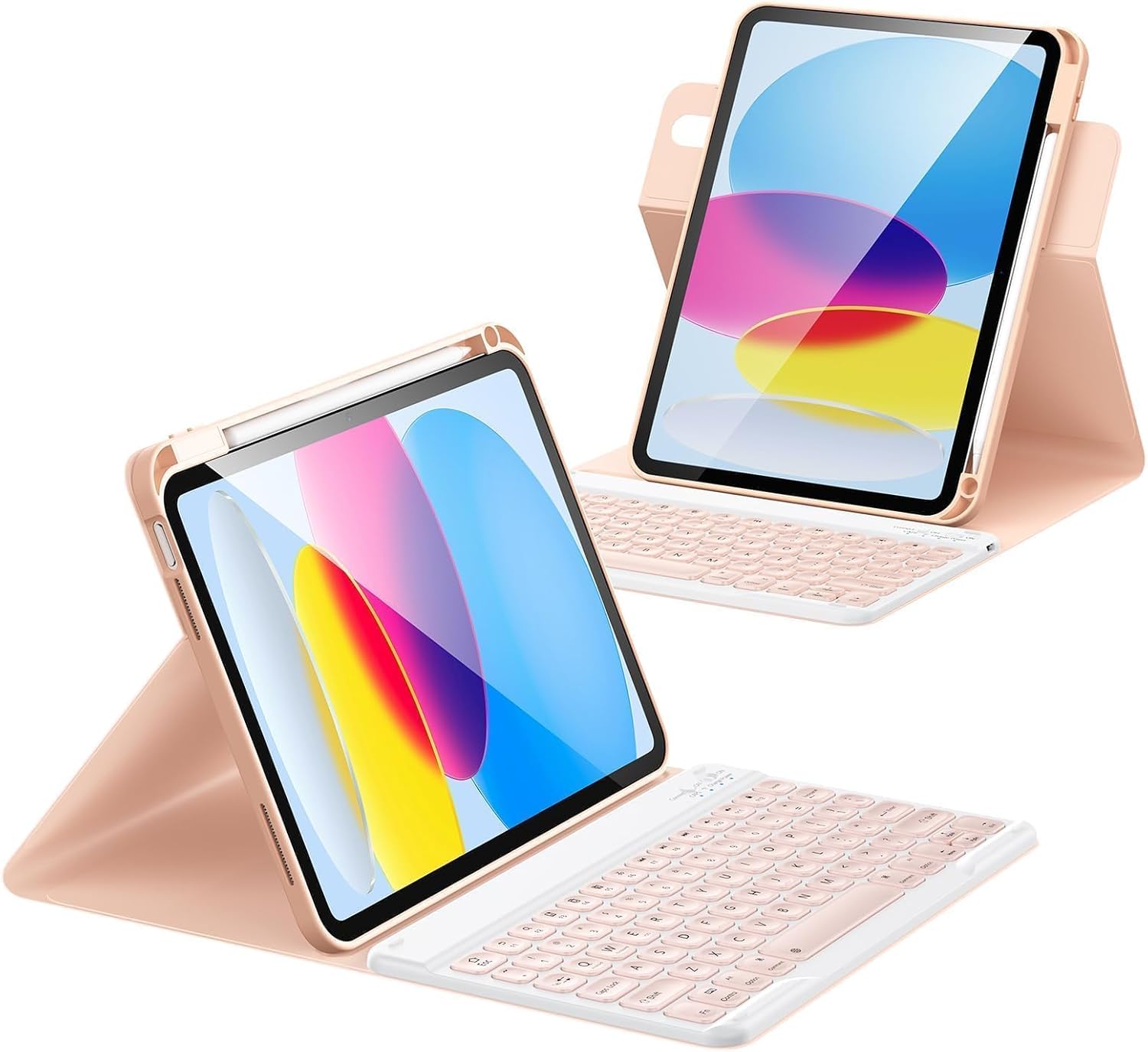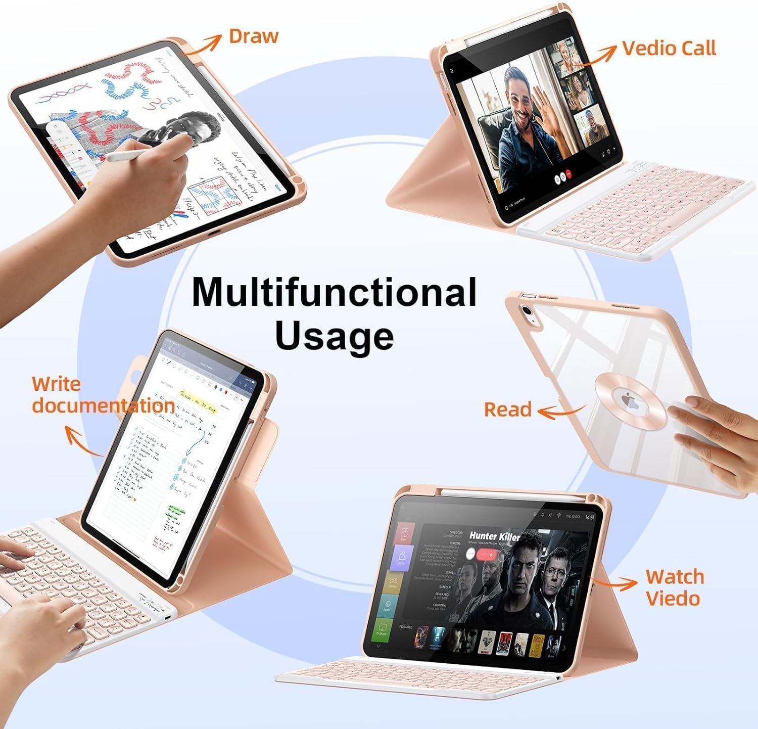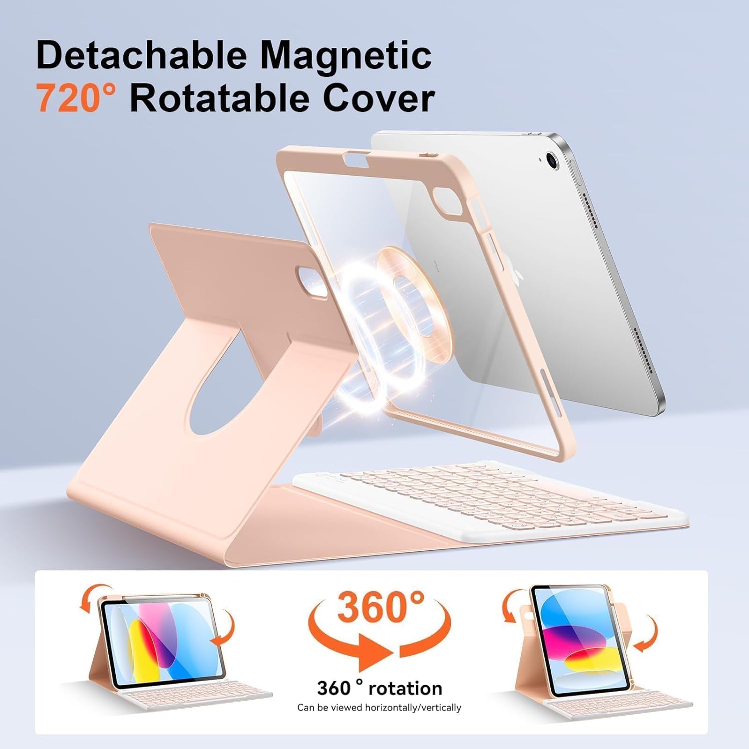 for iPad 11th 10th Generation Case with Keyboard, Magnetic 720° Rotatable Cover Detachable Wireless Bluetooth Backlit Keyboard with Pencil Holder for iPad 11 inch A16 2025 & 10.9 inch 2022 -Pink