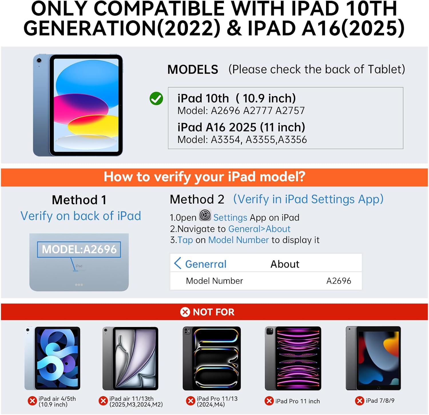 - 【Compatibility Model】 This iPad case with keyboard is designed for iPad 10th Generation 2022 10.9" (Models: A2696/A2757/A2777) and iPad 11th Generation 2025 11" A16 (Models: A3355/A3356). Not compatible with other iPad models. Confirm your device's model number (starting with "A" on the back cover) before purchase.