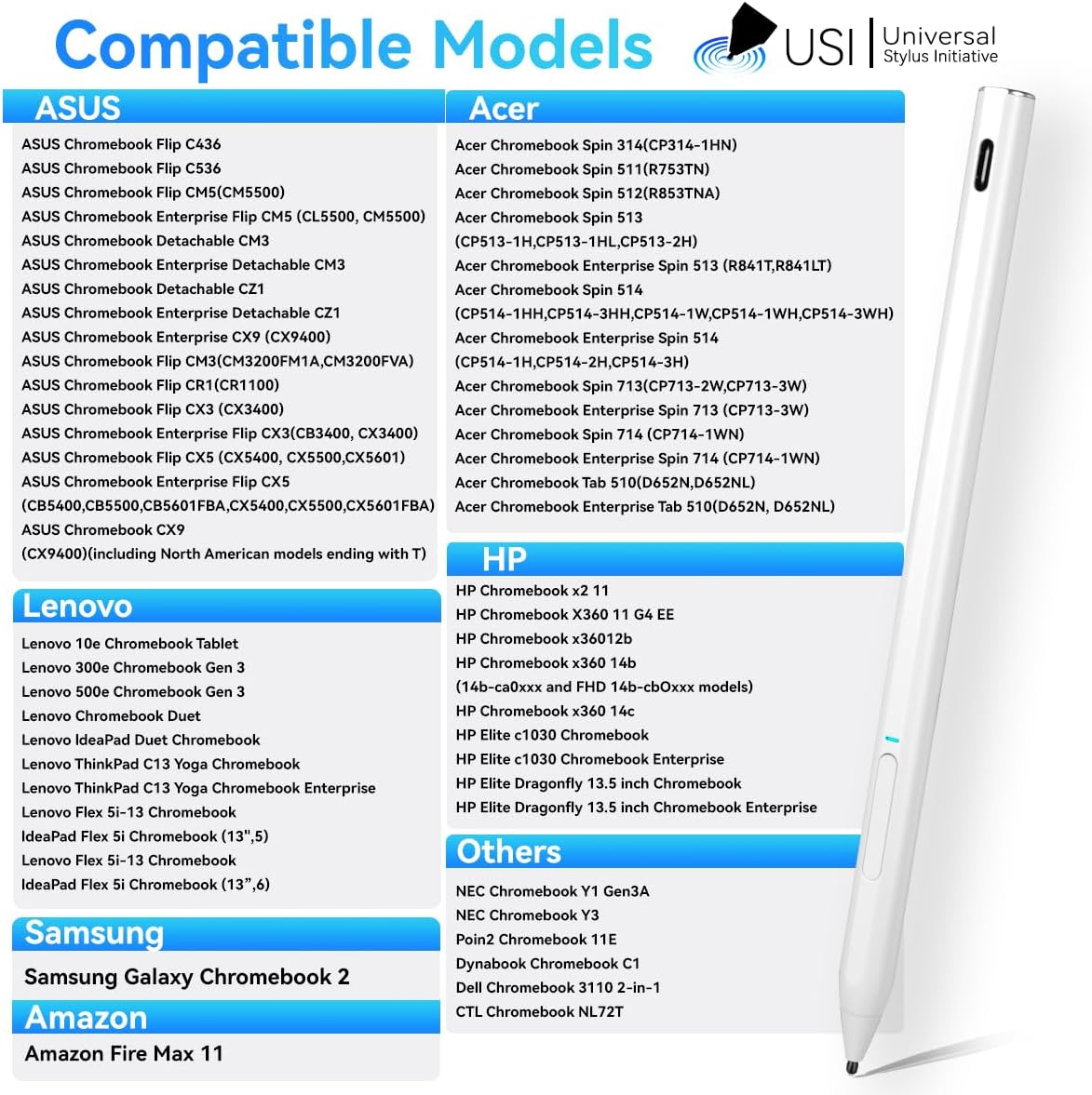 - EVACH USI 2.0 Stylus Pen for Chromebooks - The USI 2.0 stylus pen is compatible with specific Chromebook Models. Please check the model list in the description to ensure compatibility. This usi 2.0 stylus pen works with Lenovo Chromebook Duet/IdeaPad Flex, Acer Chromebook Spin, Asus Chromebook Flip, HP Chromebook, Fire Max 11 and Fire HD 10, Google Pixel Tablet