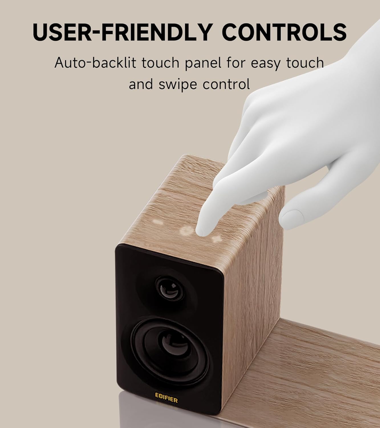 - [User-Friendly Control] Enjoy intuitive control with a cap-sensitive touch panel, featuring an automatic backlight that activates as your hand approaches and turns off automatically. Download the EDIFIER ConneX mobile app for extended functions