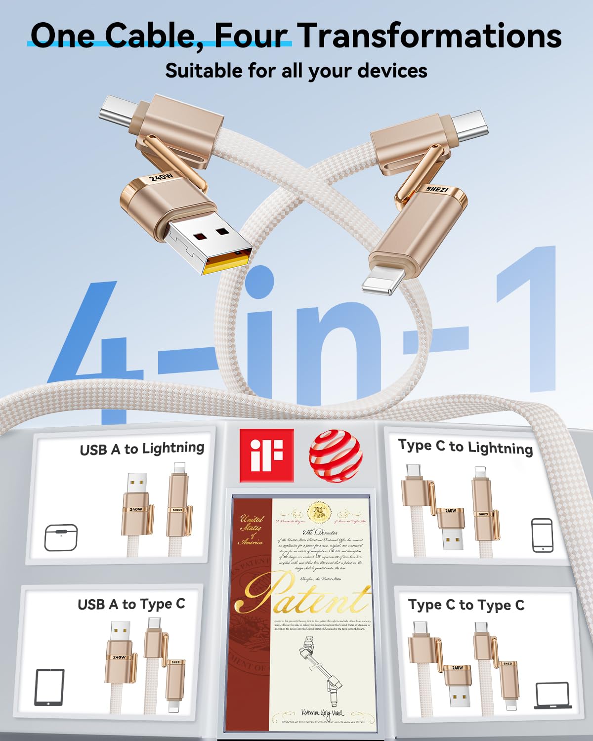 SHEZI 4-in-1 Compatible with USB C to Lightning Cable 240W Fast Charging & Data Transfer, Support to CarPlay & Android Auto, 5FT Multi Cords Charger for iPhone/iPad/Samsung/MacBook Cable, Titanium