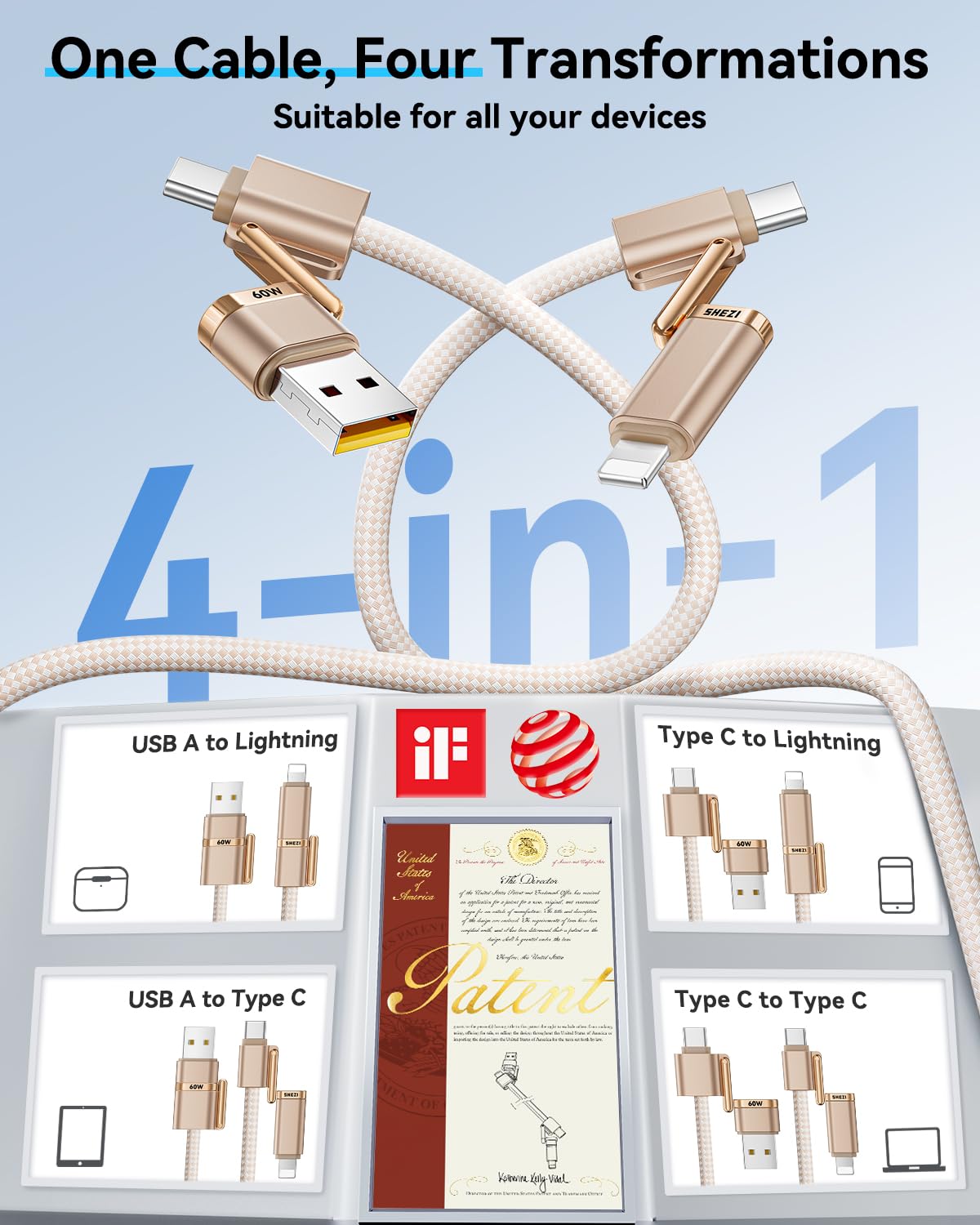 - Applestyle 4-in-1 Charging Cable - The Way of Simplicity: SHEZI is the first to launch the new Applestyle Series of 4-in-1 charger cable for devices with USB A to Lightning, USB A to Type C, Type C to Lightning, and Type C to Type C ports. One cable for all your needs. Designed with compactness and practicality in mind, it combines the minimalist look of Applestyle with 4-in-1 ports, bringing you a distinctive, minimalist and luxurious shopping experience