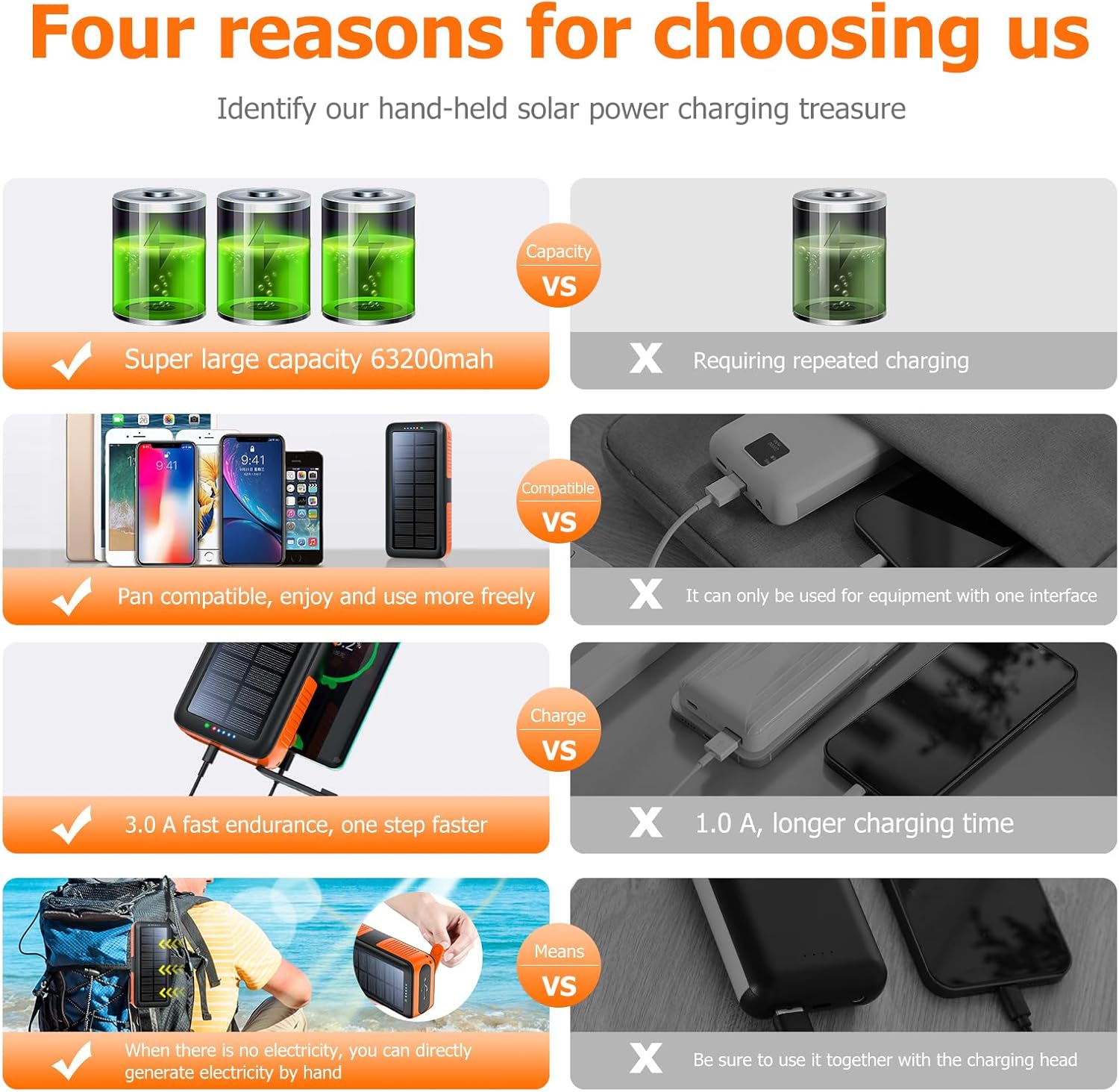 - 【Universal Compatibility & Security】: Built-in 63200mAh rechargeable Li-polymer battery, the solar power bank can charge your devices (like cellphone, camera, MP3, MP4, PSP) under the stable power supply. It can automatically adjust the output to deliver the most suitable current, keep your devices from overcharging, over-current, over-voltage and short circuit.