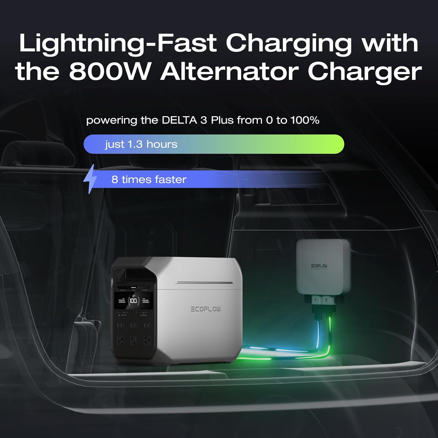 - 5 Fast Charging Options. With 1500W AC input, it charges to 80% in 40 mins. Solar charging reaches 80% in 1 hr, 100% in 70 mins. The 800W Alternator charges to 80% in 1 hr, 100% in 1.3 hrs. EcoFlow smart generator charges to 80% in 40 mins, 100% in 56 mins. Hybrid (AC + solar) charging also reaches 80% in 40 mins, 100% in 56 mins.