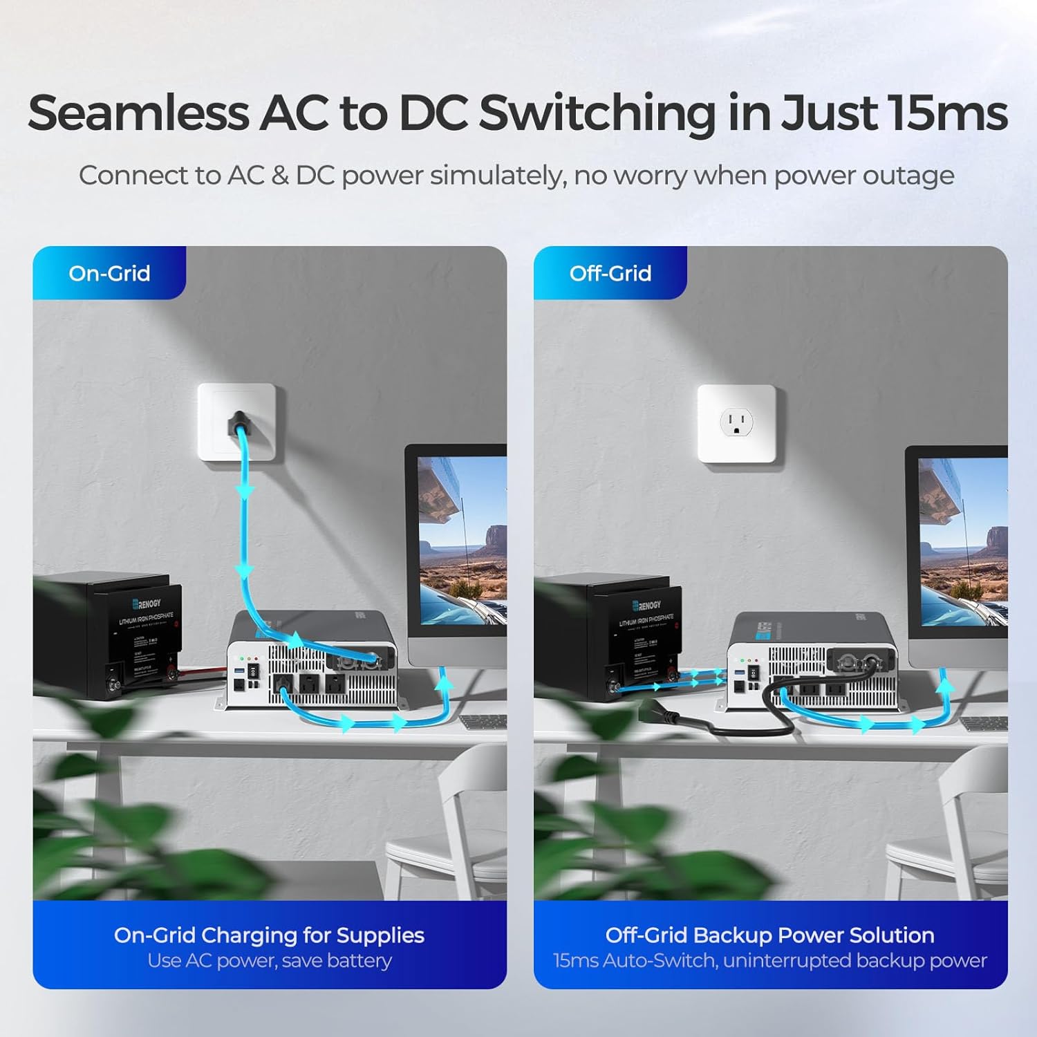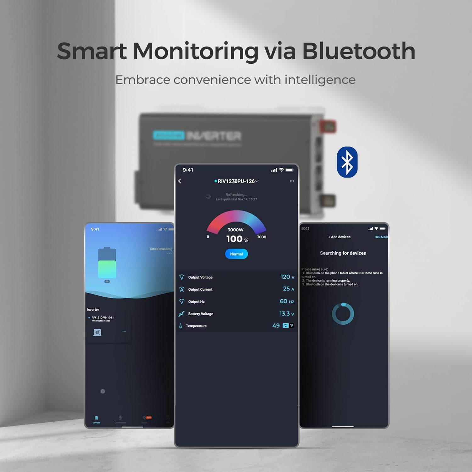 - Built-in UPS Transfer Switch & Bluetooth: This 3000 watt inverter can auto switch to grid power in 20ms, built-in design saving space on the RV and cost of purchasing the transfer switch device. Supporting remote control or Bluetooth control via Renogy APP monitoring, providing effortless connectivity and ultimate convenience
