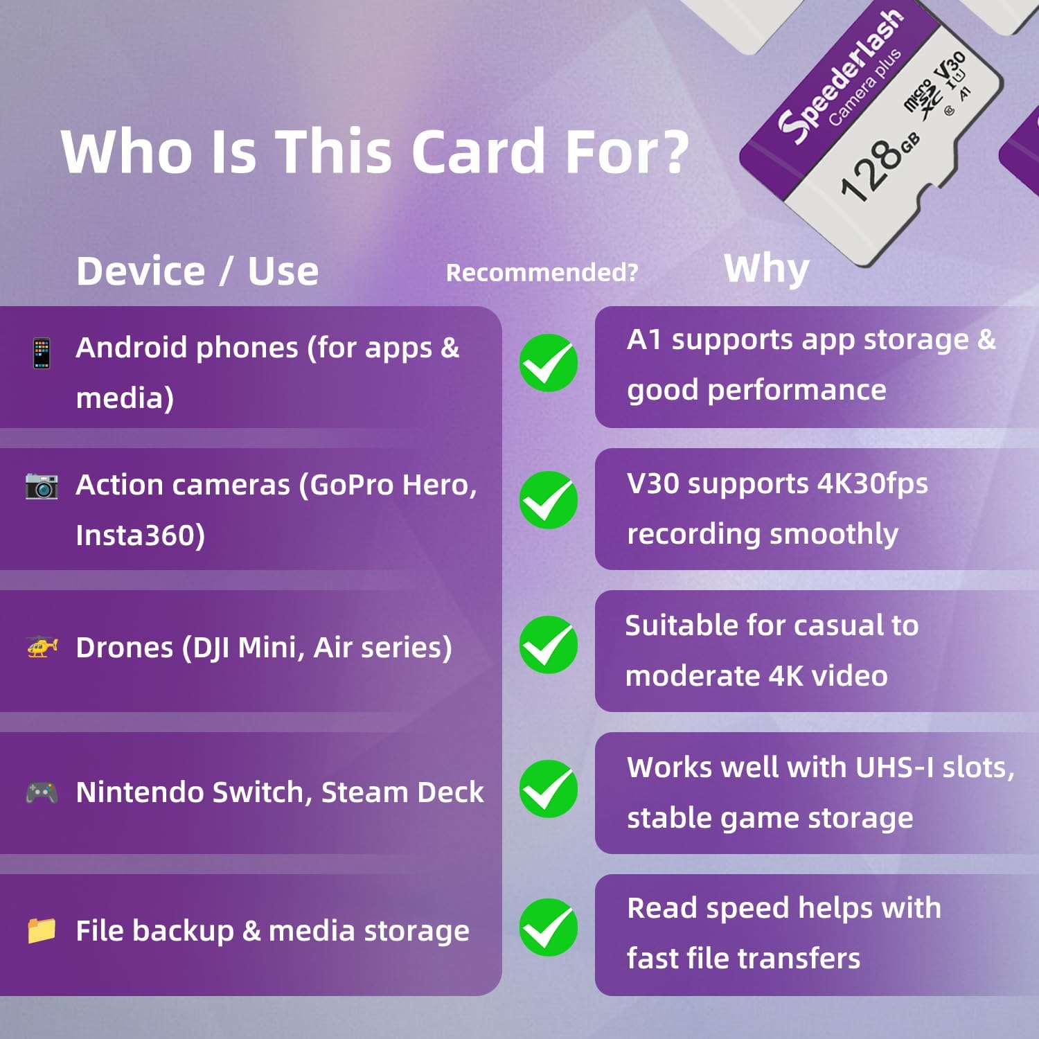 - Wide Compatibility: Compatible with a wide range of devices, including smartphones, tablets, laptops, drones, action cameras, gaming consoles like Nintendo Switch, and surveillance systems. Include an SD adapter for extended compatibility, ensuring seamless usage across various platforms.