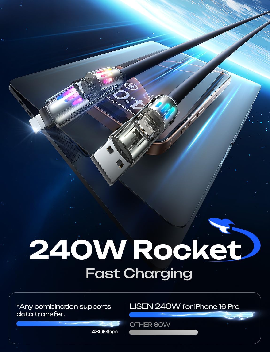 - [What You Get]LISEN 4-in-1 USB C cable 3ft, a length suitable for any situation, so you no longer need to stay near a power outlet. Additionally, our reliable customer service is available 24/7—if you have any questions or issues, feel free to contact us. We guarantee resolution within 24 hours. Please note, the 240W USB-C cable can power laptops through the Thunderbolt port, but it is not a USB 3.0/4K cable.